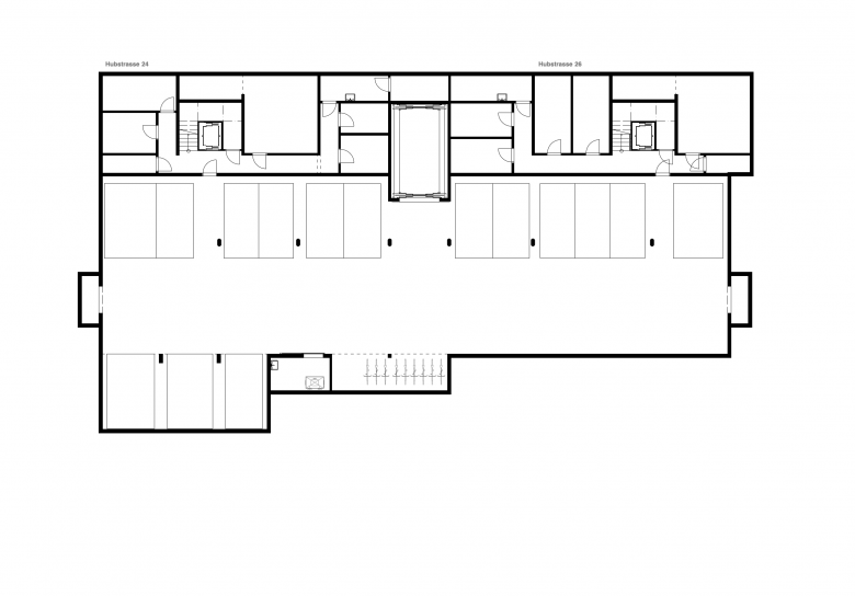 Die kompakte maximale Wohn-Nutzung über Terrain bedingt eine tief im Gelände liegende Einstellhalle für die gesetzlich geforderten Auto-, Velo- und Motorradstellplätzen sowie für den Bedarf an Kellerräumen und Technikräumen. Die tiefe Baugrube begünstigt den Einsatz eines Autoliftes.