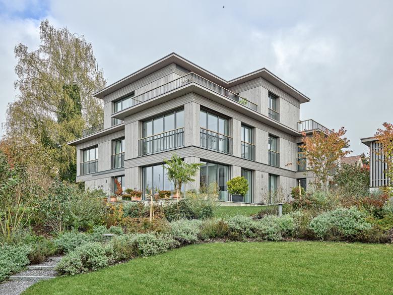 Die beiden Gebäude beinhalten je vier Wohnungen unterschiedlicher Lage und Grösse, die über ein zentrales Treppenhaus erschlossen werden. Das Angebot reicht von grossen Gartenwohnungen über kleinere und mittlere Geschosswohnungen mit wetter-unabhängigen Vier-Jahreszeiten-Zimmer bis zu den Attikawohnungen mit allseitigen Terrassen-Decks. Alle Wohnungen sind stark mit dem intensiv bepflanzten Grünraum in Wechselwirkung.