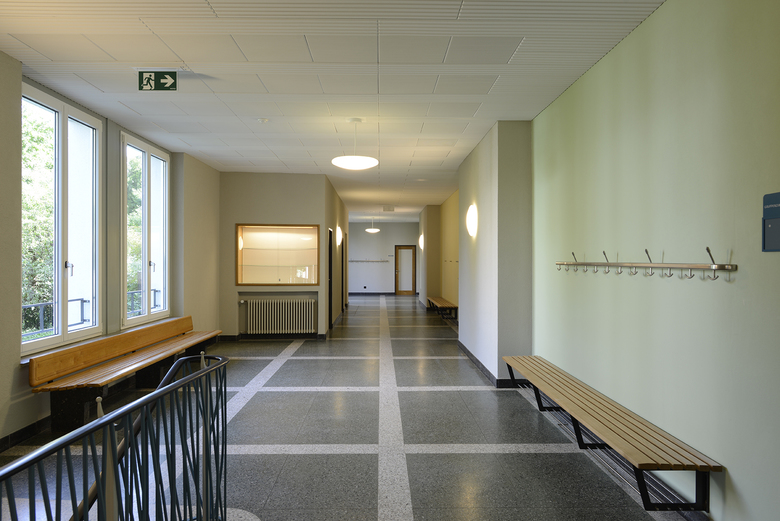 Die relevante Substanz beginnt auf der Stufe des Städtebaus - also beim Verhältnis vom Baukörper zum Aussenraum -, zeigt sich in den qualitätsvollen einfachen und überschaubaren inneren Raumfolgen und manifestiert sich an gepflegten konstruktiven Details. Die Eingriffe, die bei einer Umnutzung und bautechnischen Sanierung wie der Schulanlage Brunnenmoos anstehen, müssen das Wesen des Bauwerkes und den hochwertigen Bestand an Vorgefundenem respektieren, indem dieser geschützt und restauriert wird. Normative Nachrüstungen für den Brandschutz, das hindernisfreie Bauen oder eine zeitgenössische technische Ausstattung sollen im Dialog mit dem Bestand implementiert werden.
