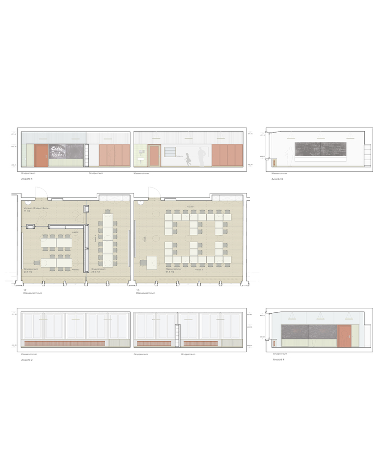 Die vergleichende Analyse des künftigen Raumprogramms mit der bestehenden Raumstruktur lässt den Schluss zu, dass sich im Schultrakt A die Primarschule einrichten lässt und dass im Spezialtrakt C die Handarbeit und die Musikschule untergebracht werden können. Die Kindergarten sowie die Tagesbetreuung mit dem Mittagstisch passen bestens im Schultrakt B.