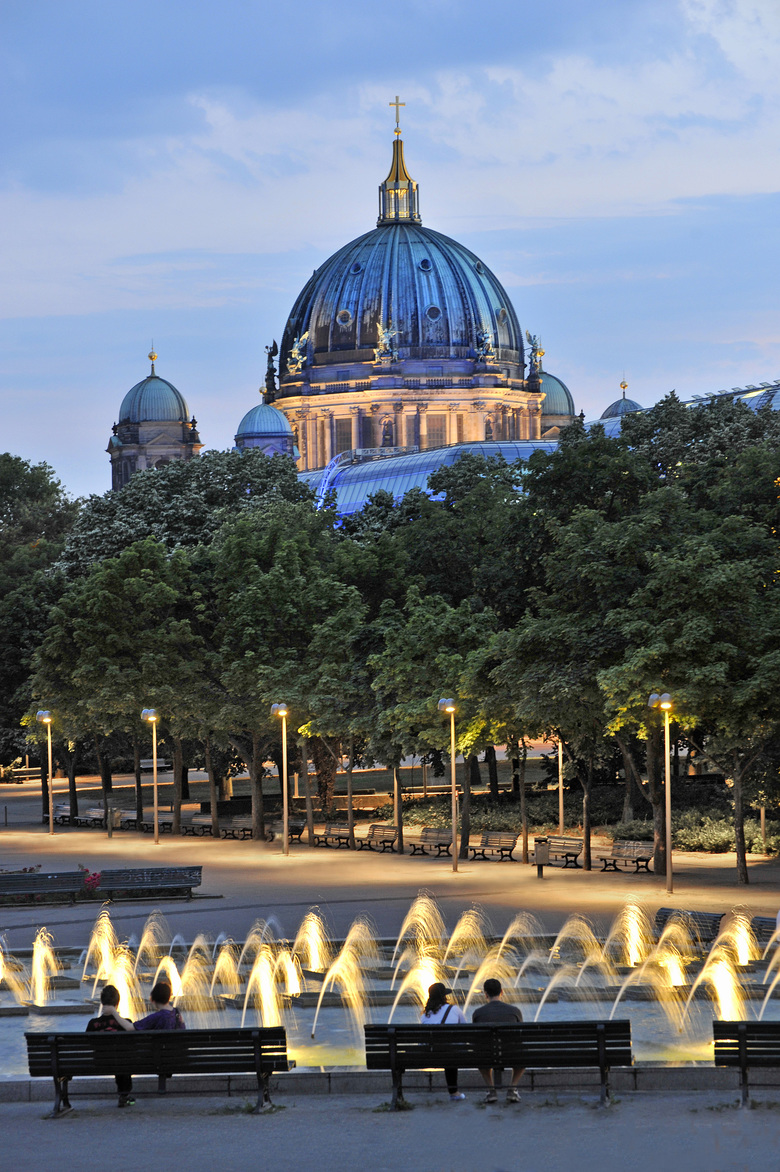 The landscape architects have defined three area typologies which are individually emphasized by their lighting. The area in direct proximity to the television tower is the so called “town square” with an airy, open character. The area between Spandauer Strasse, Karl-Liebknecht-Strasse and the television tower is called “city garden,” which connects the Neptune Fountain with the cascade fountain through its main axis. This area has an ordered character with its raised garden beds and two rows of trees. In contrast, the area between Spandauer Strasse, Karl-Liebknecht-Strasse, and the river Spree is defined as a “city park” with more natural vegetation.