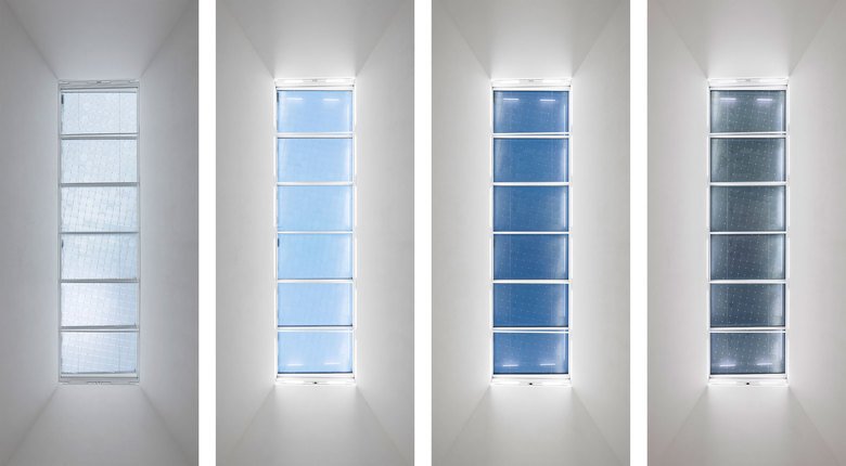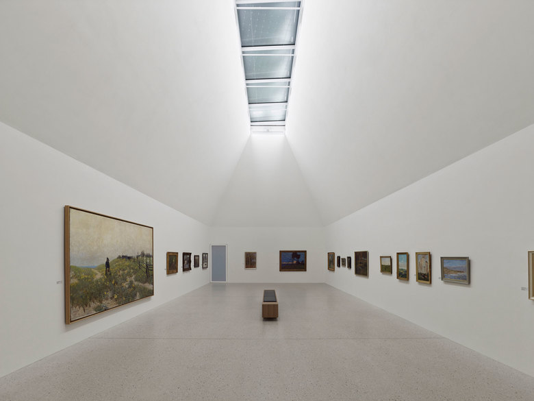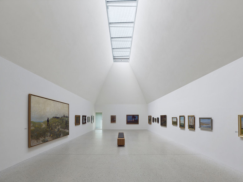 The daylight strategy in the skylight spaces of the Art Museum Ahrenshoop has been developed in close collaboration with the architectural design process. The exhibition spaces are equipped with elongated horizontal daylight openings. In order to generate a light distribution, which is perceived as virtually shadow-free, prisms have been integrated into the skylight glazing. The electric illumination should emulate the daylight situation by entering the space through the same skylight opening. For this purpose, the lighting profiles are integrated in the perimeter skirting of the skylight. By dimming the light sources, the illuminance levels can be flexibly controlled between 50 and 250 lx. For accent lighting, a 3-phase-track to accommodate LED projectors has been implemented below the light profile.