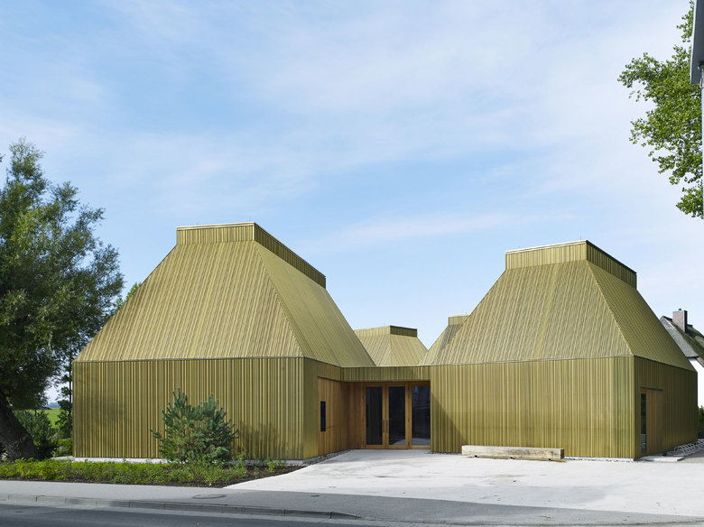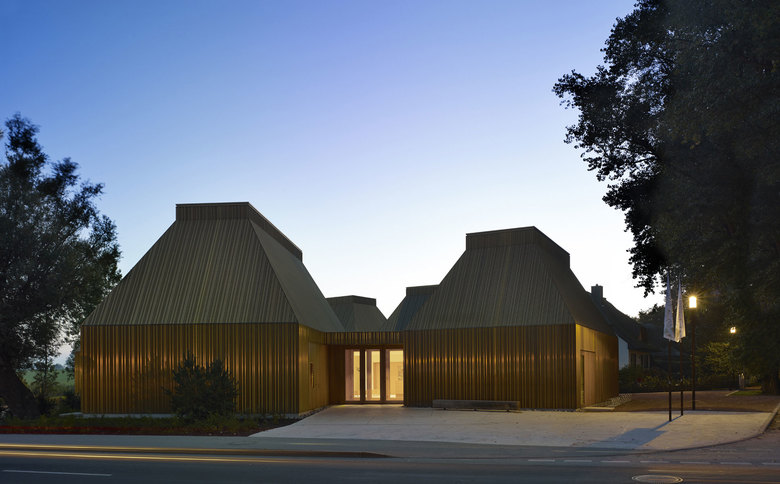 The building layout is based on the pictorial imagery of thatched roof houses, examples of which can be seen steps away from the museum location. Grouped around a central foyer, an ensemble of five one-room buildings have been developed to house the exhibition spaces. The roof shapes merge into a sculptural composition that unites the individual houses into a holistic complex. For the façade cladding, a thermally insulated metal material has been chosen that, in line with the overall concept, is a reinterpretation of the traditional thatched roof. Seemingly randomly profiled bronze panels create a lively building envelope that, due to weathering, visually approaches the hue and texture of thatches. Only at close inspection does the actual material become apparent.