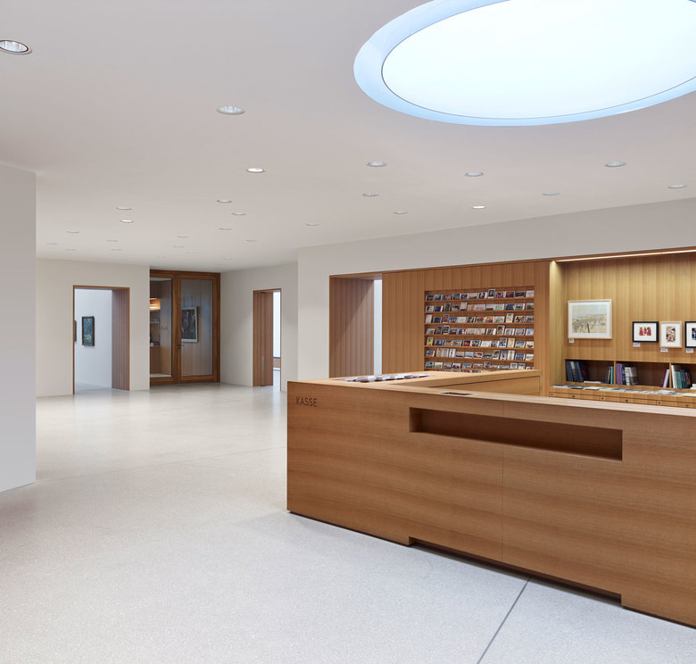 The foyer is largely illuminated by downlights and wall-washers. By emphasizing the walls, the spatial boundaries become tangible and thus contribute to a pleasant indoor atmosphere. In addition, the uniform wall illumination offers an additional display surface for art exhibits, which can be shown at appropriate light levels by virtue of the luminaires’ ability to be dimmed. The slender space between Building IV and Building V is covered by three adjustable projectors. Here, sculptures and objects can be accordingly featured with directional, resonant light. Integrated in the skylight above the counter, dimmable light profiles generate ample brightness in the area. The shelves in the shop and the coatroom are illuminated by light strips integrated and concealed in the millwork. This ensures an appropriate illumination of the merchandize.