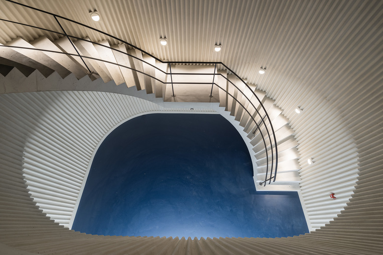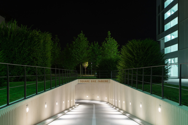For the entrances to the bike parking, generous ramps and stair cases are illuminated by low-level wall recessed luminaires. A sophisticated detail integrates the fittings discreetly into the wavy concrete wall.