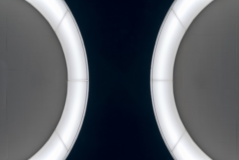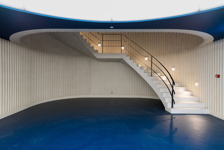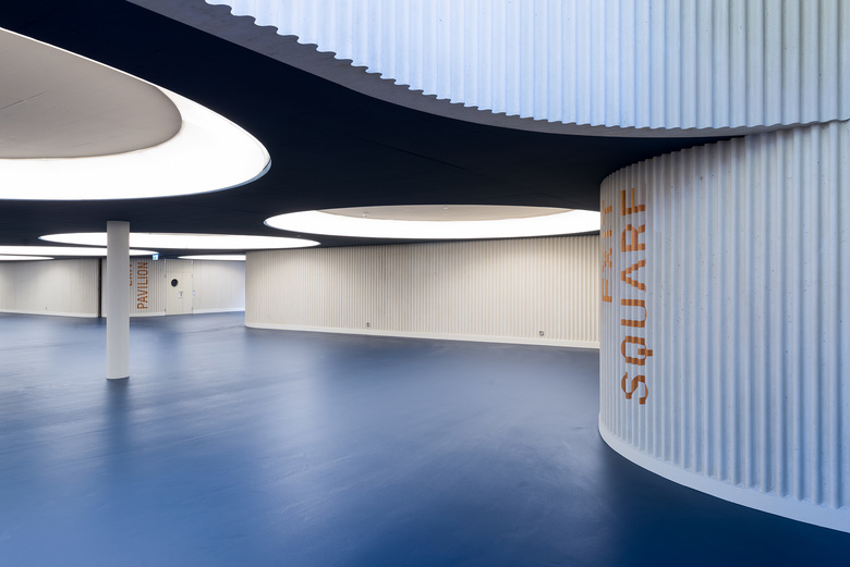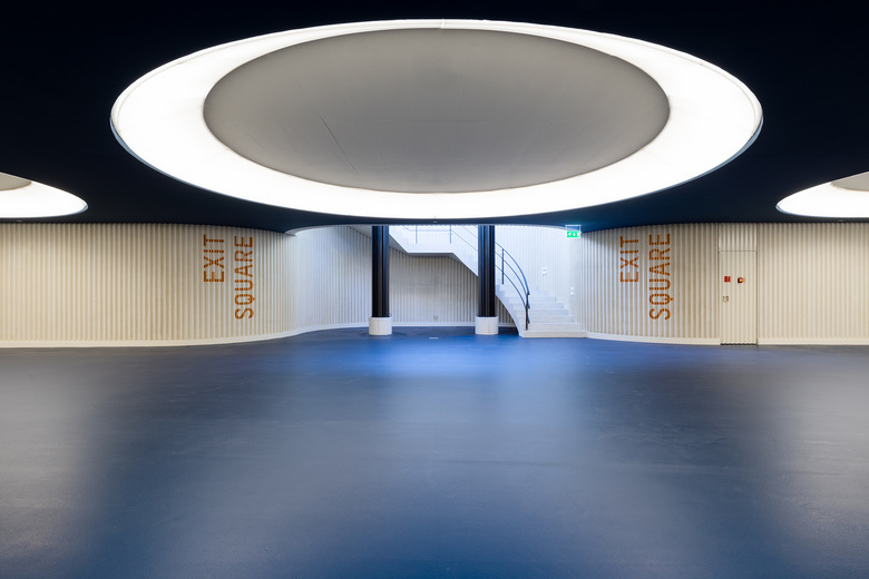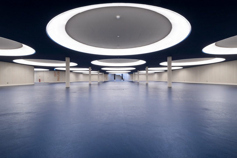 Inspired by the famous Brazilian architecture of Lina Bo Bardi, architect Marco Serra gave the underground space corrugated concrete walls, while the exposed concrete ceiling and the PU flooring display a deep blue hue. The organic design vocabulary of the ribbed wall is continued in 16 large circular ceiling recesses, into which the team at Licht Kunst Licht planned oversized diffuse ring luminaires with a stately exterior diameter of 7m. The striking graphic gesture of the 16 luminous “wheels” is the result of a complex custom luminaire development.