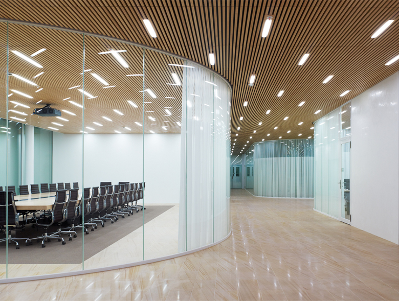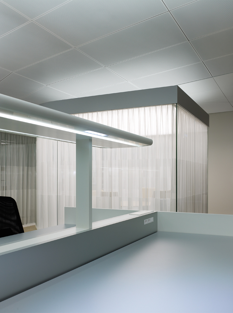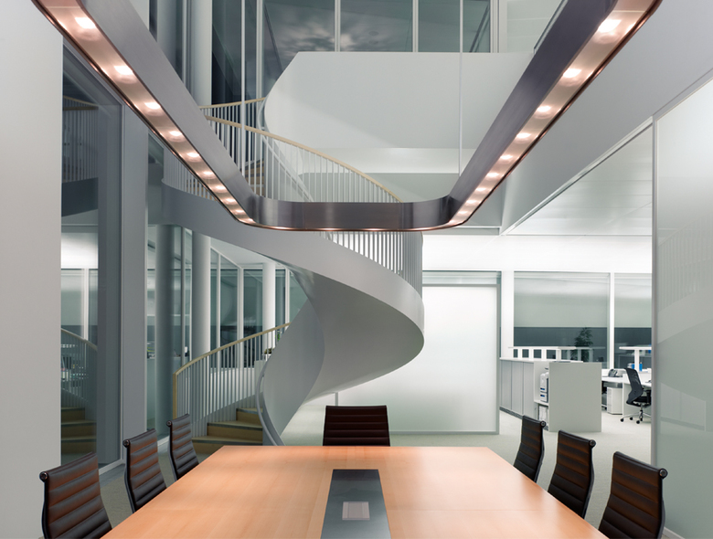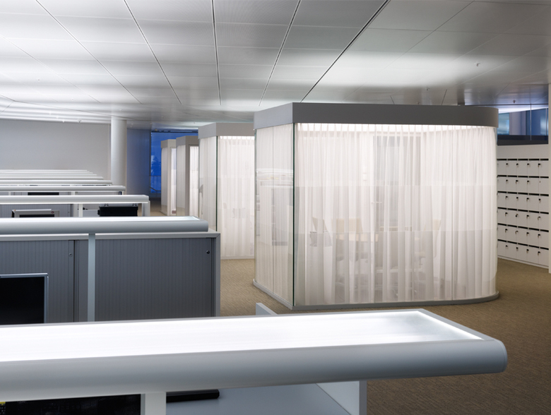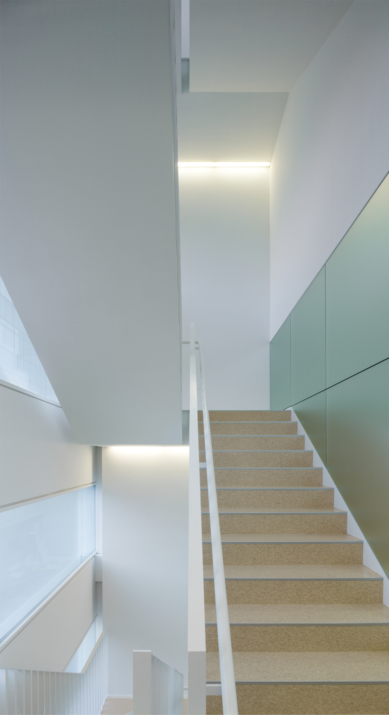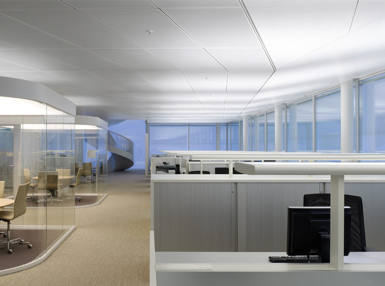 The concept of transparency and spatial flow was the main idea of Maki & Associates for the new office building on the Novartis Campus in Basel. A continuous, flexible working space has been created where all ceilings are sloped at different angles and all office floors are interlinked by double height spaces. To stress the open and flowing character, the main lighting objective was to indirectly highlight the ceiling surfaces and to illuminate the building whilst retaining the ceiling untouched. Specially designed luminaires for the open office have been designed to achieve the target of a softly uplit space.