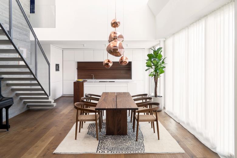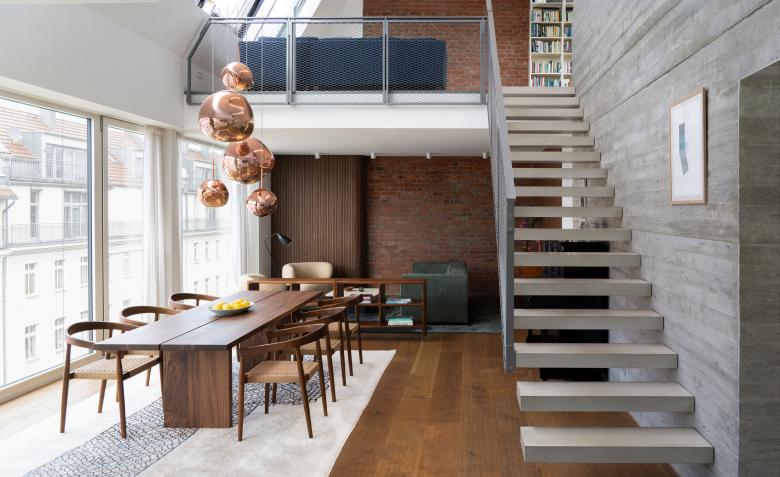 Loft K in Berlin Mitte, a two-story rooftop extension by STP-Architects, is characterized by its flowing horizontal and vertical transitions, exuding openness and generosity. The newly designed interior by Lien Tran Interior Architecture now creates areas for both transparency and retreat. In contrast to the exposed concrete walls and floor-to-ceiling windows that define the loft's urban character, the sheltered living areas designed by Lien Tran offer a home that provides a sense of retreat for the family. Starting with sophisticated wooden lamellas, and extending to tactile textiles and the natural warmth of wood, an exciting dialogue between urbanity and retreat unfolds.