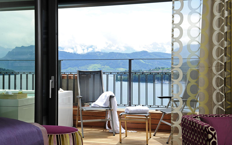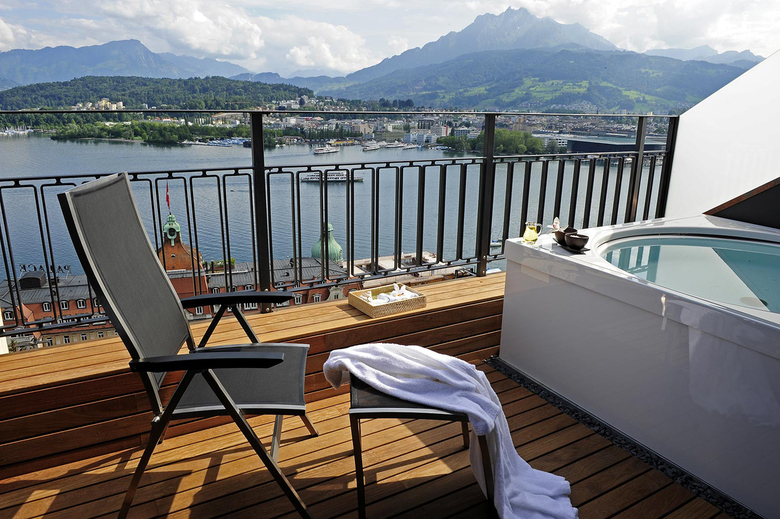 Die spektakuläre Panoramasicht auf den Vierwaldstättersee und die Berge veranlasste Ligno dazu, sechs luxuriöse Penthouse Spa Suiten mit Aussen-Whirlpool auf der privaten Terrasse, teilweise mit Sauna, Dampfbad und alle mit individuell regulierbarer Raumbeduftung zu konzipieren. Für die Raumgestaltung entwickelte Ligno den bestehenden Art Deco-Stil zum «Art Deco Avantgarde» weiter: Für die Suiten wurden eigene Möbel mit hochwertigen Materialien, Oberflächen und Details entworfen.