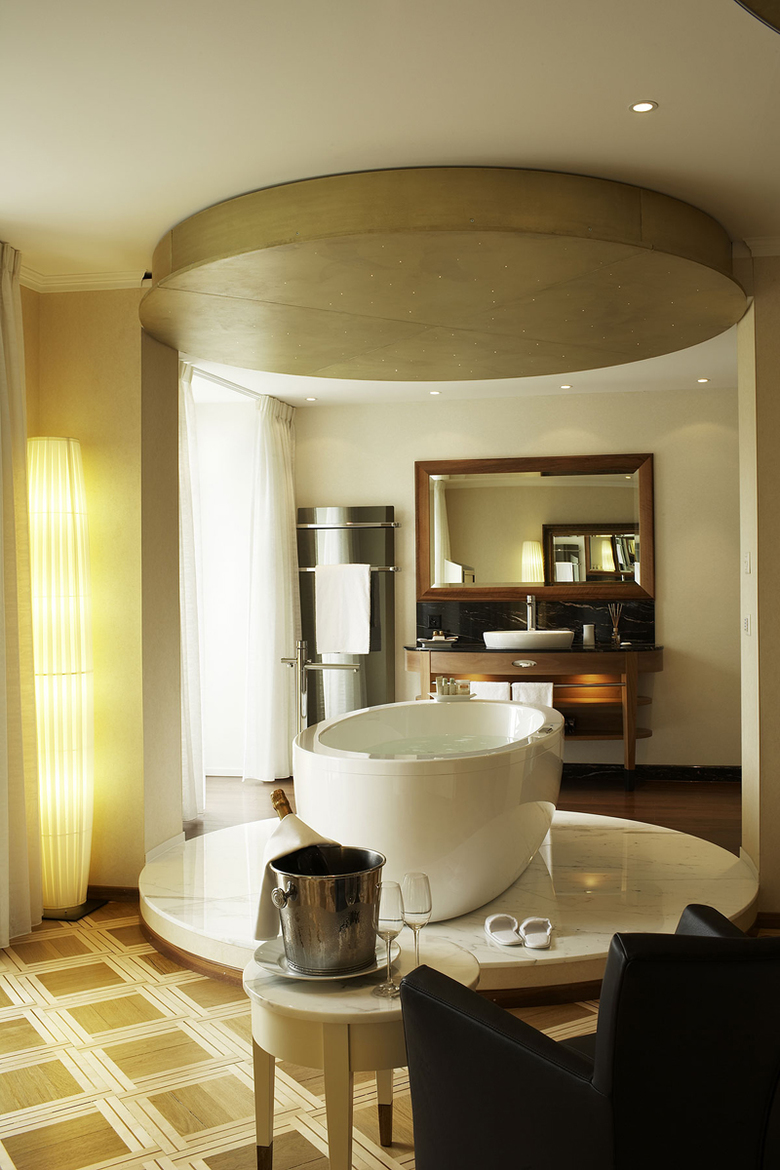 Der Geschichte des Hauses Rechnung tragend gestaltete Ligno alle Räume in einem zeitlosen klassisch-modernen Stil mit warmem Ambiente. Das Konzept für Restaurant mit Bar und Lounge orientiert sich an den fliessenden Formen der Reuss. Die geschwungene Bar aus Nussbaumholz erinnert an einen Schiffsbug.