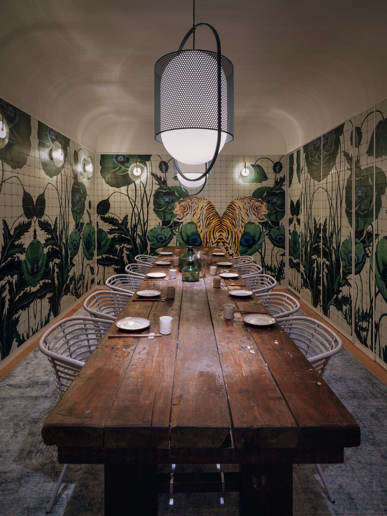 The private dining rooms are lined in hand-painted tiles featuring large scale illustrations of commodities traded between the British and Chinese in the 18th century such as medicinal poppies and exotic animals. The room is enveloped by a hand racked arched plaster ceiling. Reclaimed terracotta tiles pave the main dining hall, sourced from abandoned houses in rural China.