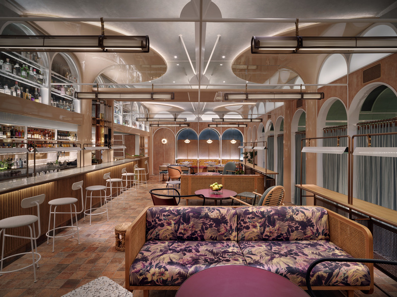 The main dining hall in the restaurant is an interpretation of the storehouses in the docklands. The modern vaulted space plays on verticality, lightness and has a sense of whimsy with circular canopy columns in a dusty pink lacquer and white metal arches surrounded by terracotta render.