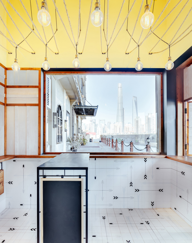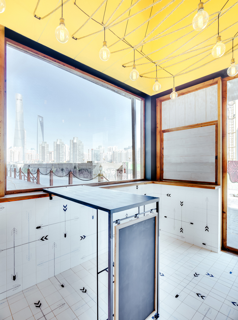 Linehouse was asked to create a new modern fast food identity for Lone Ranger; a hot dog shop, incorporating a wild west theme. Replacing the entire façade of the shop located at the waterfront of the Huangpu River, Shanghai, Linehouse created a playful composition of white timber weatherboards, raw timber, and custom printed tiles featuring an arrowhead motif.