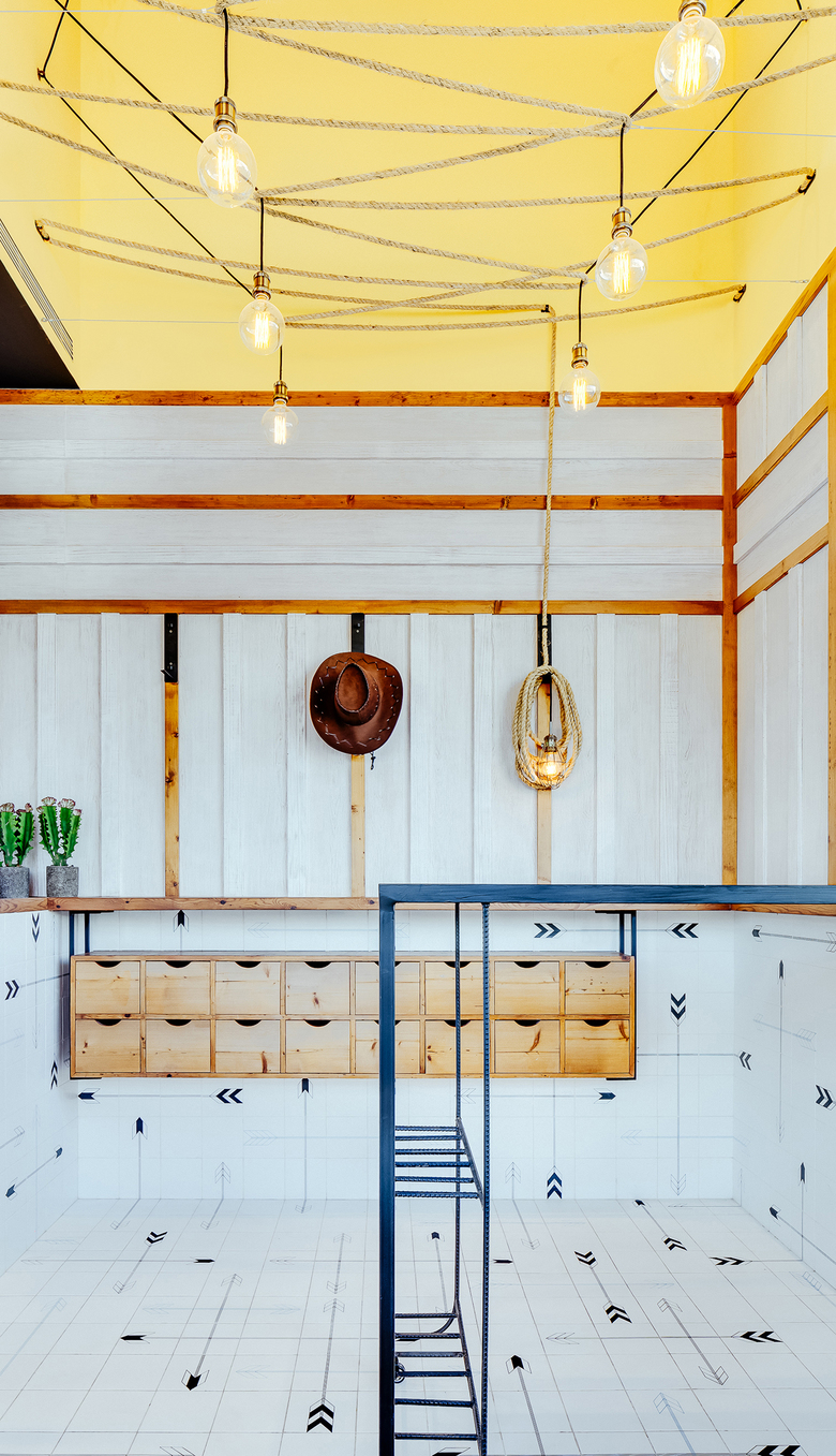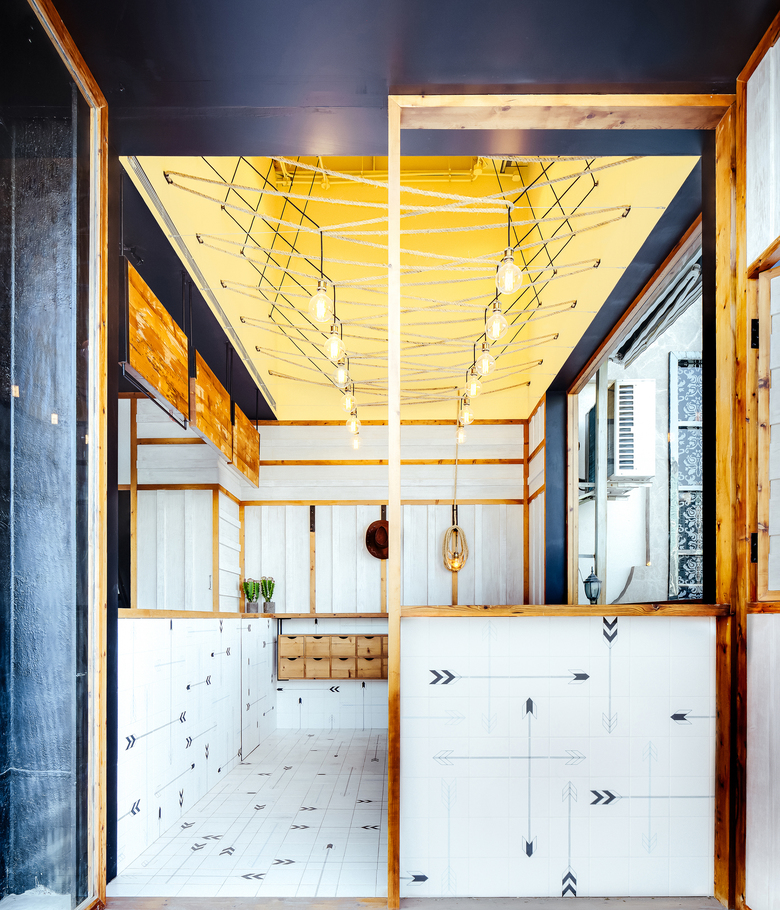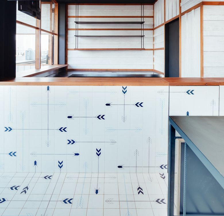 The exterior is composed of opening doors and shutter panels, which when opened reveals the continuous tile pattern that wraps the counters and floors. The exterior counters seats 6 with a further 6 seats inside. The 4m high ceiling void is painted a bright yellow with a woven rope structure which creates an apparatus for the lights to hang from.