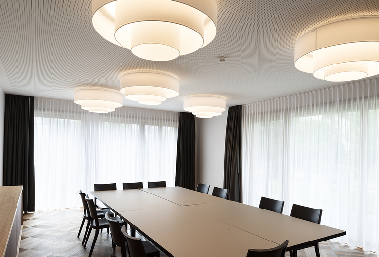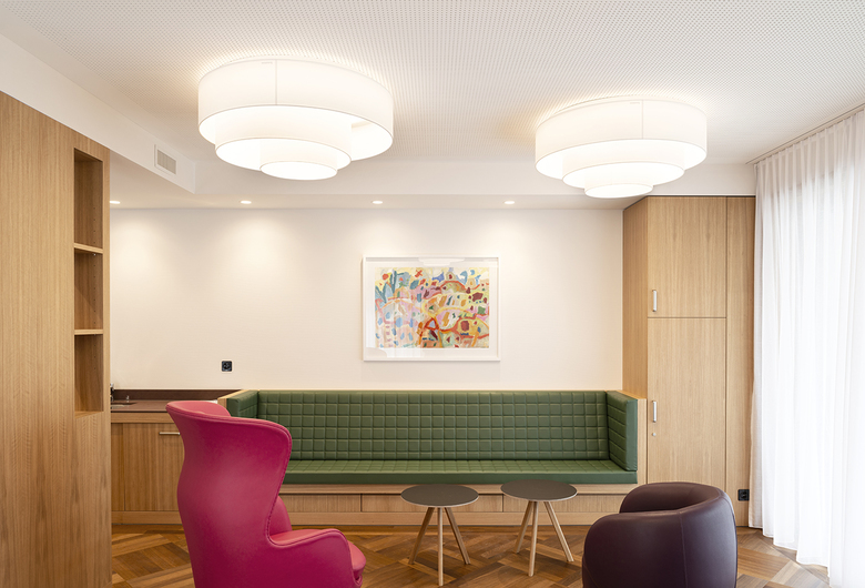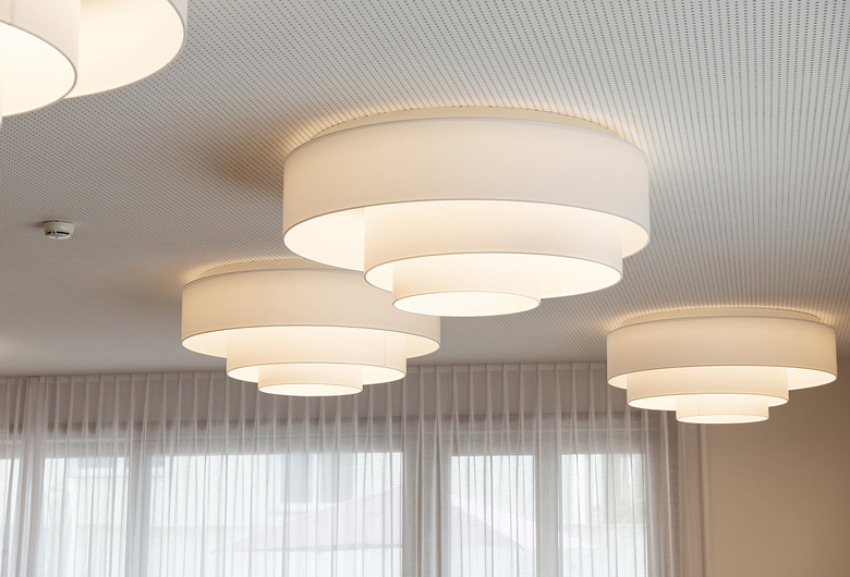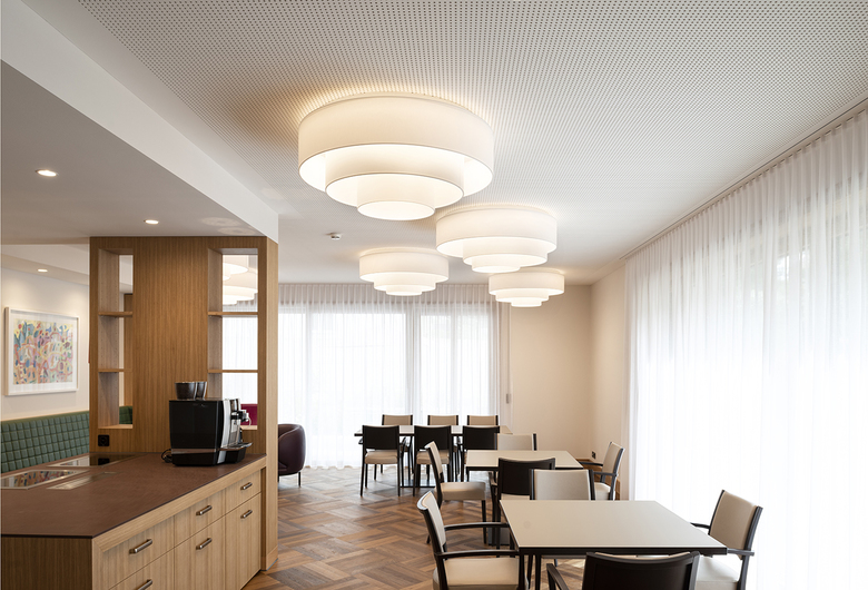 LA TORTA – war der Arbeitstitel der grossformatigen Deckenleuchten, die wir in Zusammenarbeit mit der Firma Licht+Raum AG für das Zentrum Freitag entwickeln durften. Die Anforderung war, die Räume zum richtigen Zeitpunkt mit viel blendfreiem, gleichmässig verteiltem Licht zu bespielen. Dadurch kann der Lichtmangel, dem Menschen mit Demenz ausgesetzt sind, da ihre Aktivität nachlässt, teilweise kompensiert werden.