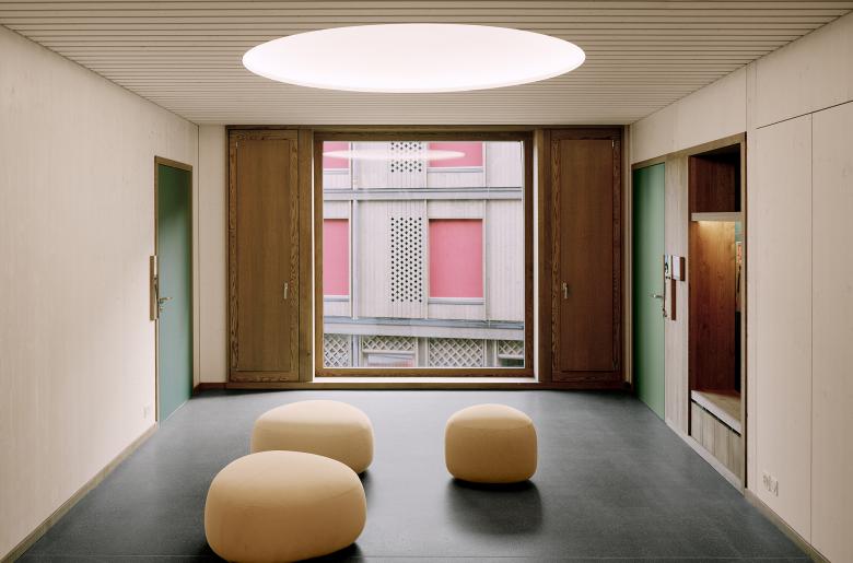 Für die Klientenbereiche wurde hauptsächlich Indirektlicht eingesetzt. Eigens entwickelte Kuppelleuchten in Aufenthaltsbereichen und indirektstrahlende Lichtbänder in den Erschliessungszonen leuchten die Räumlichkeiten absolut blendfrei aus.