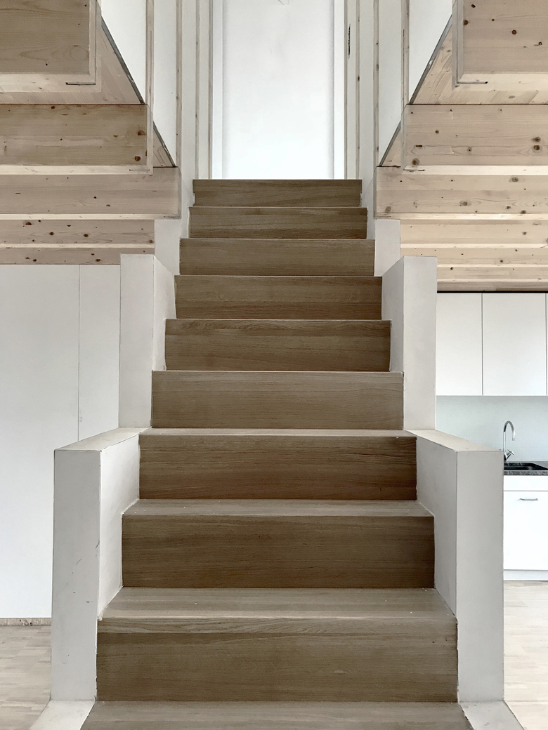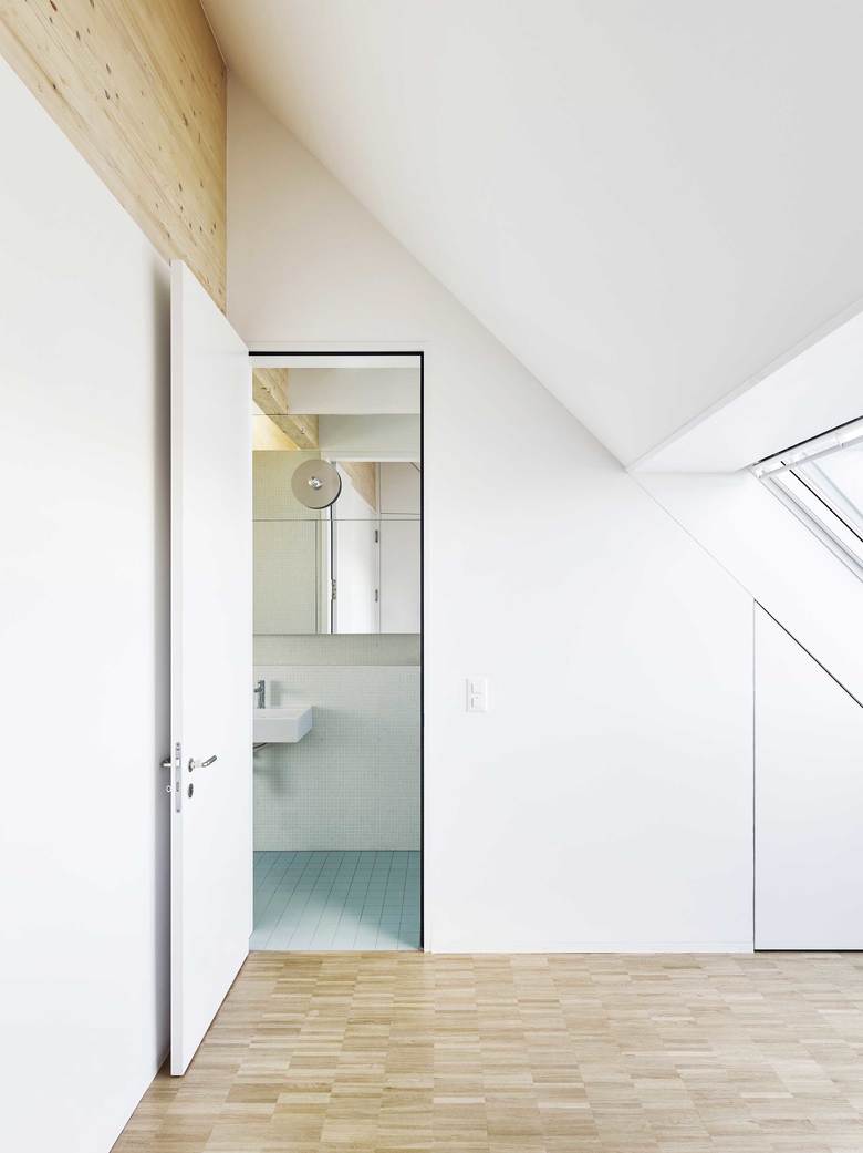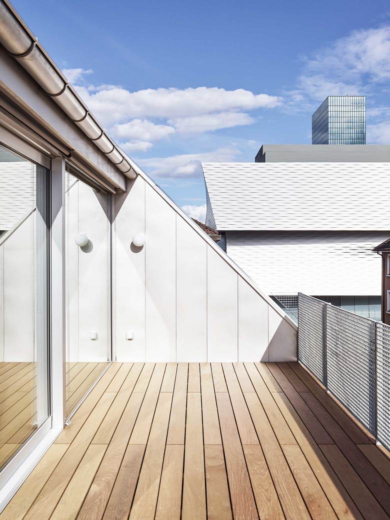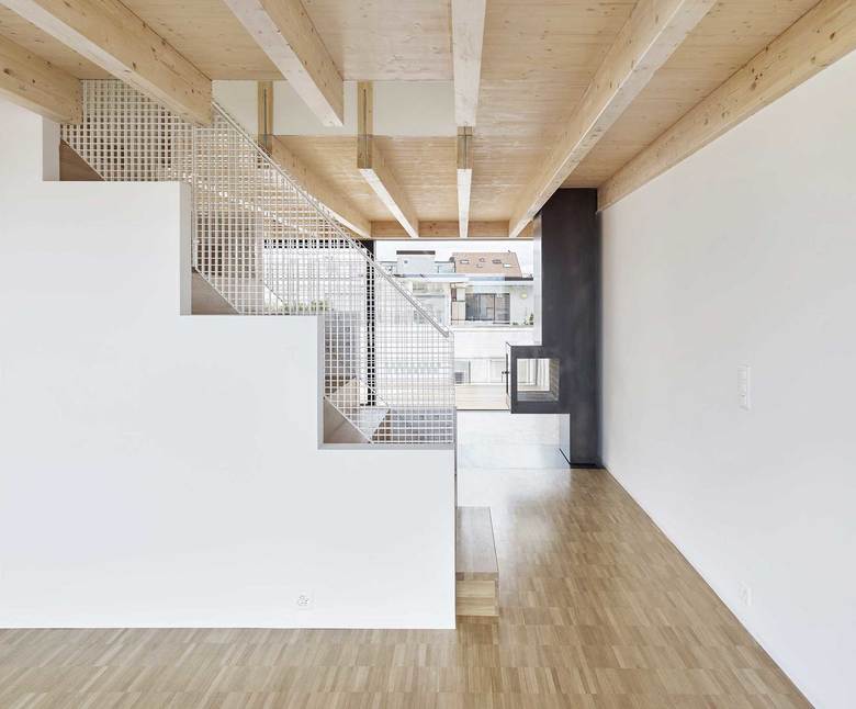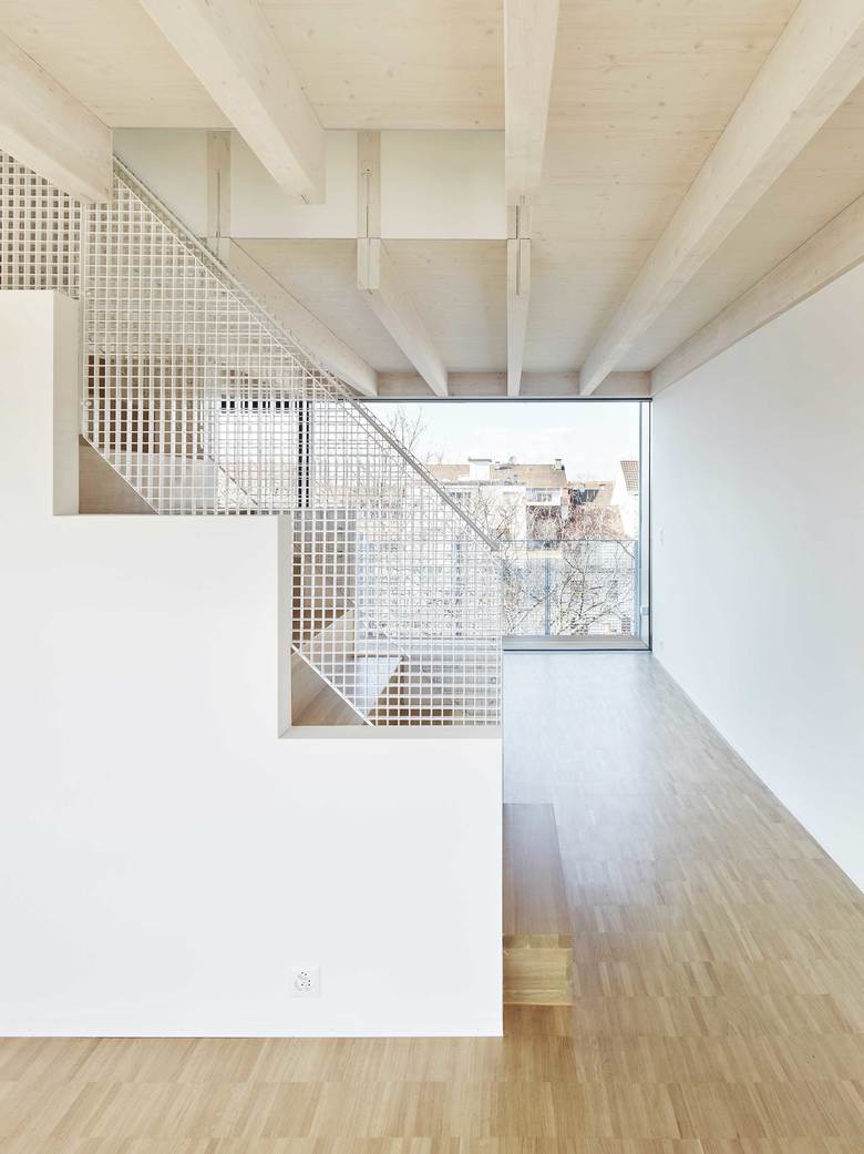 Ausgangslage des Entwurfes ist ein um 1925 erbautes Mehrfamilienhaus in Basel, welches um zwei Stockwerke erweitert wurde. Als wesentliches konstruktives Prinzip sind zwischen die beiden Brandmauern zwei Firstpfetten gespannt. Sie ermöglichen eine hängende Dachkonstruktion in vorfabriziertem Holzbau. Entstanden sind zwei symmetrische Maisonettewohnungen mit – durch die Konstruktion bedingt – unterschiedlichen räumlichen Qualitäten. So sind im oberen Geschoss die introvertierteren Schlafräume angeordnet und im unteren Stockwerk die nach aussen gerichteten Wohnräume.
