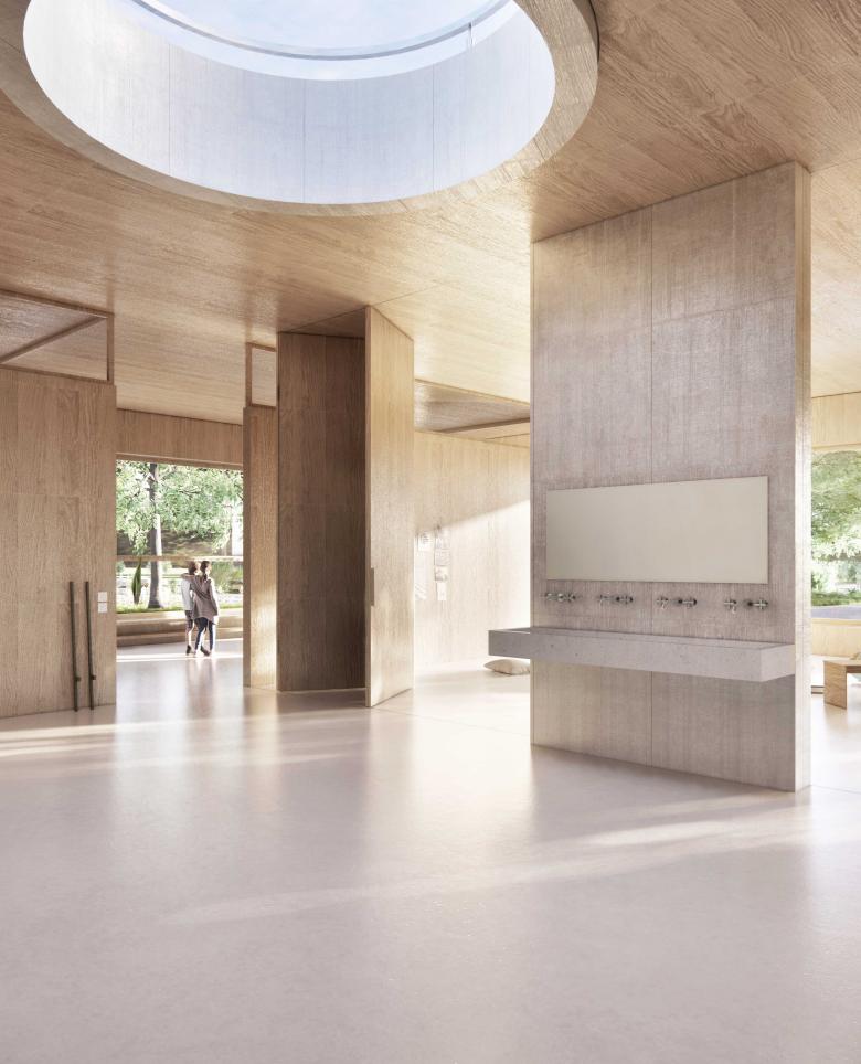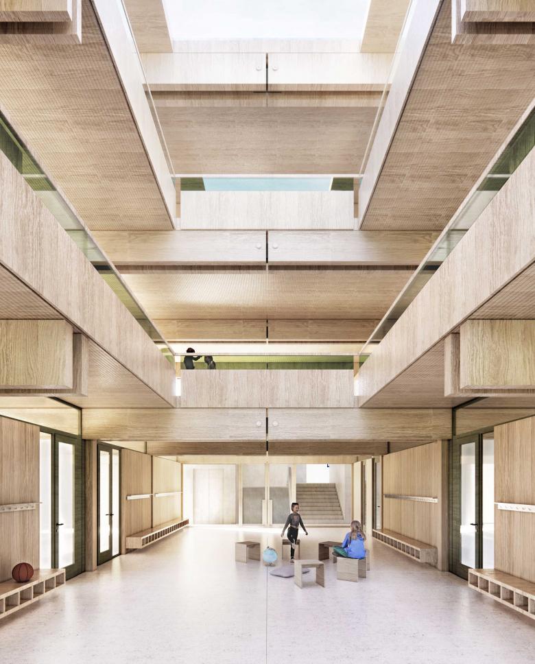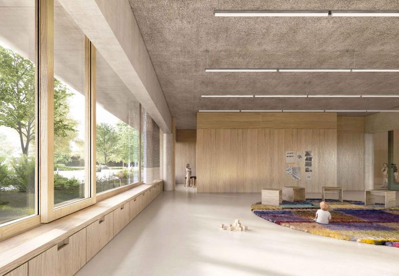 Der prominente Knotenpunkt zwischen Bestandsschule und neuem Schulhaus, der die hochinstallierten Nasszellen beider Volumen bündelt, verbindet sämtliche Geschosse und wird als vertikaler Fluchtweg ausgebildet. Hier befindet sich der Zugang zur Primarschule. Gesondert erschlossen heben sich die erdgeschossigen Kindergärten rücksichtsvoll von den Primarbereichen ab. Die sich südlich des Gestaltungsperimters befindliche Kindertagesstätte ist in ihrer Disposition dem Kindergarten nahe verwandt. Ebenso basierend auf einer grosszügigen, stützenfreien Raumstruktur, bietet die Tagesstätte multifunktionale Nutzungsmöglichkeiten und räumliche (Sicht-) Bezüge untereinander.