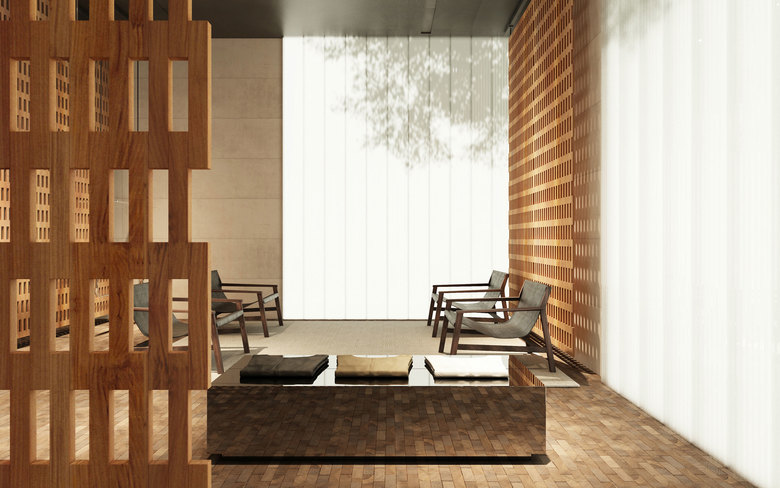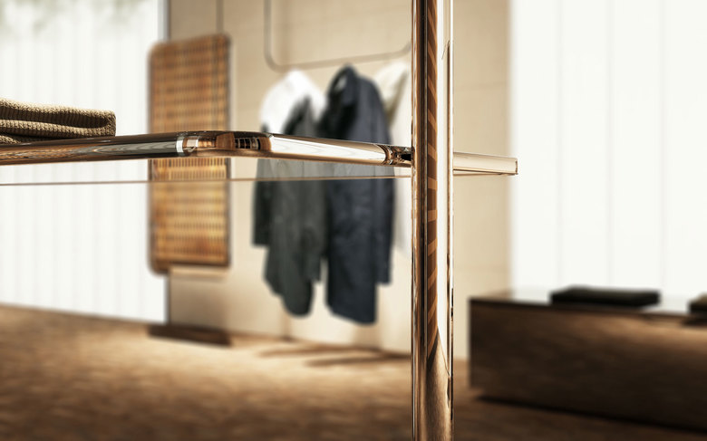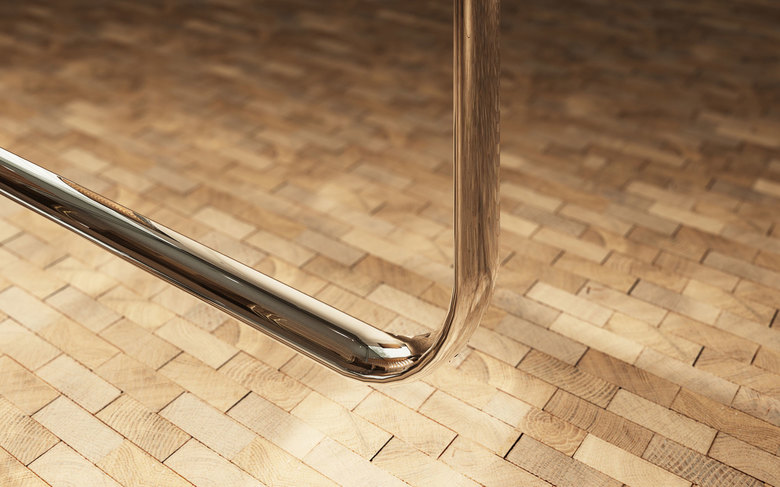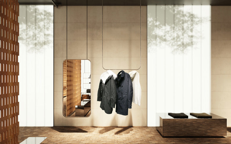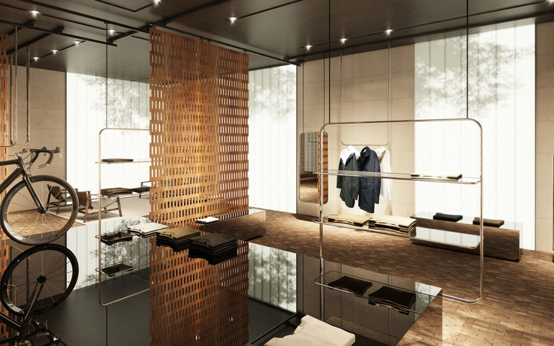 A handshake between a raw room and refined boutique is how we described the big idea. For the tough, industrial side, we introduced end grain flooring, warm grey ceramic tiles that resemble worn concrete, and exaggerated glass profiles – all evocative of a factory. The shadow of a tree projected on to the glass panels brings a touch of nature into the city, and celebrates Jet Set’s roots in outdoor pursuits. To highlight the innovation, high-tech textiles and engineering behind the brand’s products, we designed a series of sophisticated oval frames in anodized steel. These artistic features contrasted with the industrialised shell to create an effect as dramatic as seeing Princess Grace slalom down a slope.