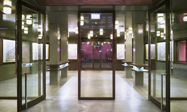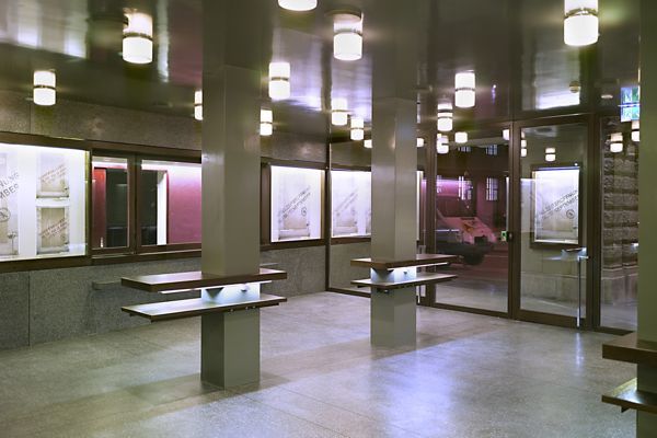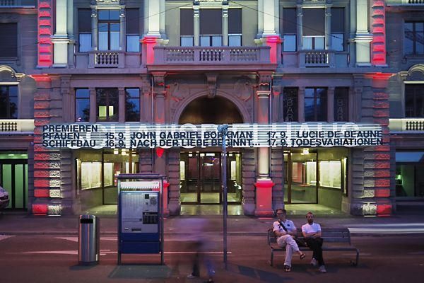 Side walls in the foyer were arranged at an angle. When people arrived at the theatre the foyer looked short. When they left, the space looked long. A specially designed terrazzo floor disguised the angle of the walls to make the illusion even more spectacular. Our client, the City of Zürich, appreciated this contemporary and sophisticated piece of architectural theatre.