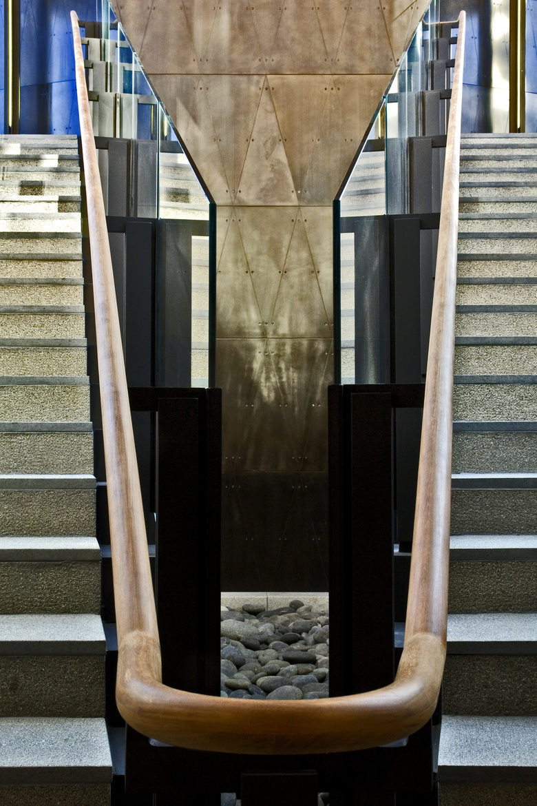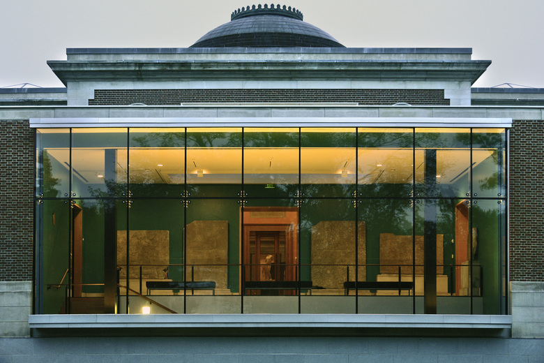 The design addresses new program needs, necessary code and accessibility upgrades and incorporates state of the art security and climate control systems to meet current museum standards. A dramatic glass, bronze and blackened steel pavilion on the south side of the original building provides a new entry to the expanded museum from the town of Brunswick to the West, and the Bowdoin College quad to the East. This six hundred square foot pavilion houses a gracious new steel and stone stair and glass elevator which lead down to visitor service spaces and a new lower level gallery entrance.