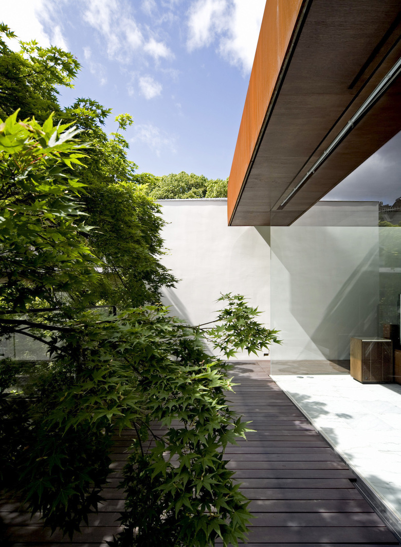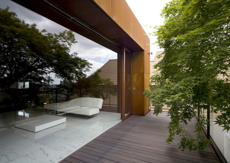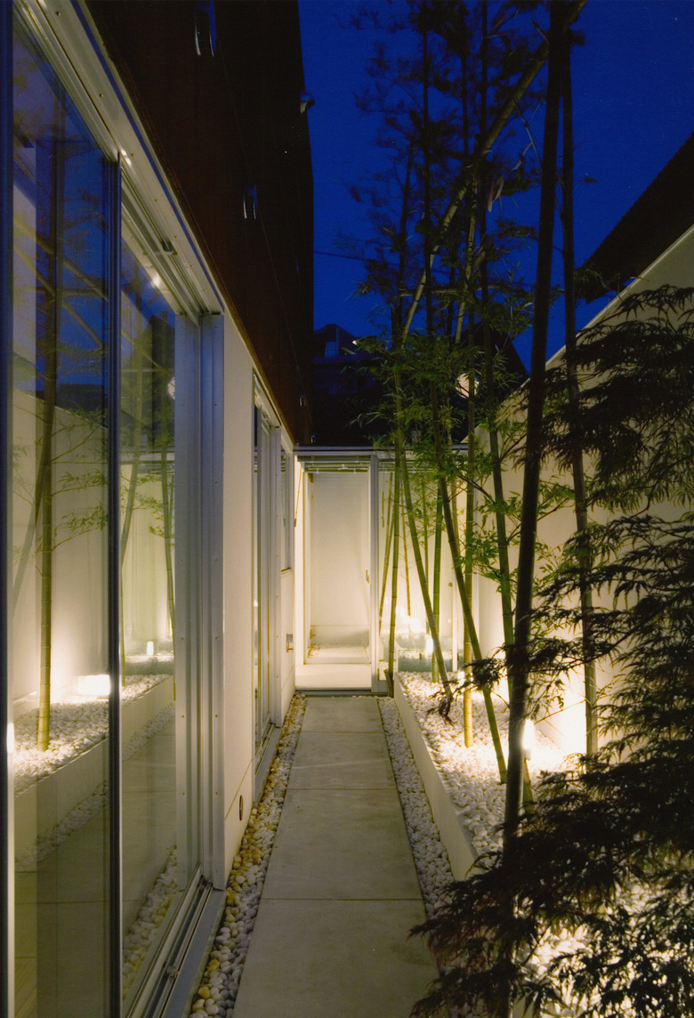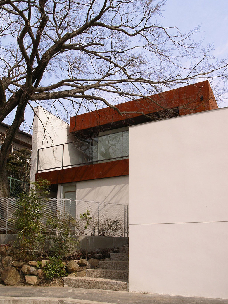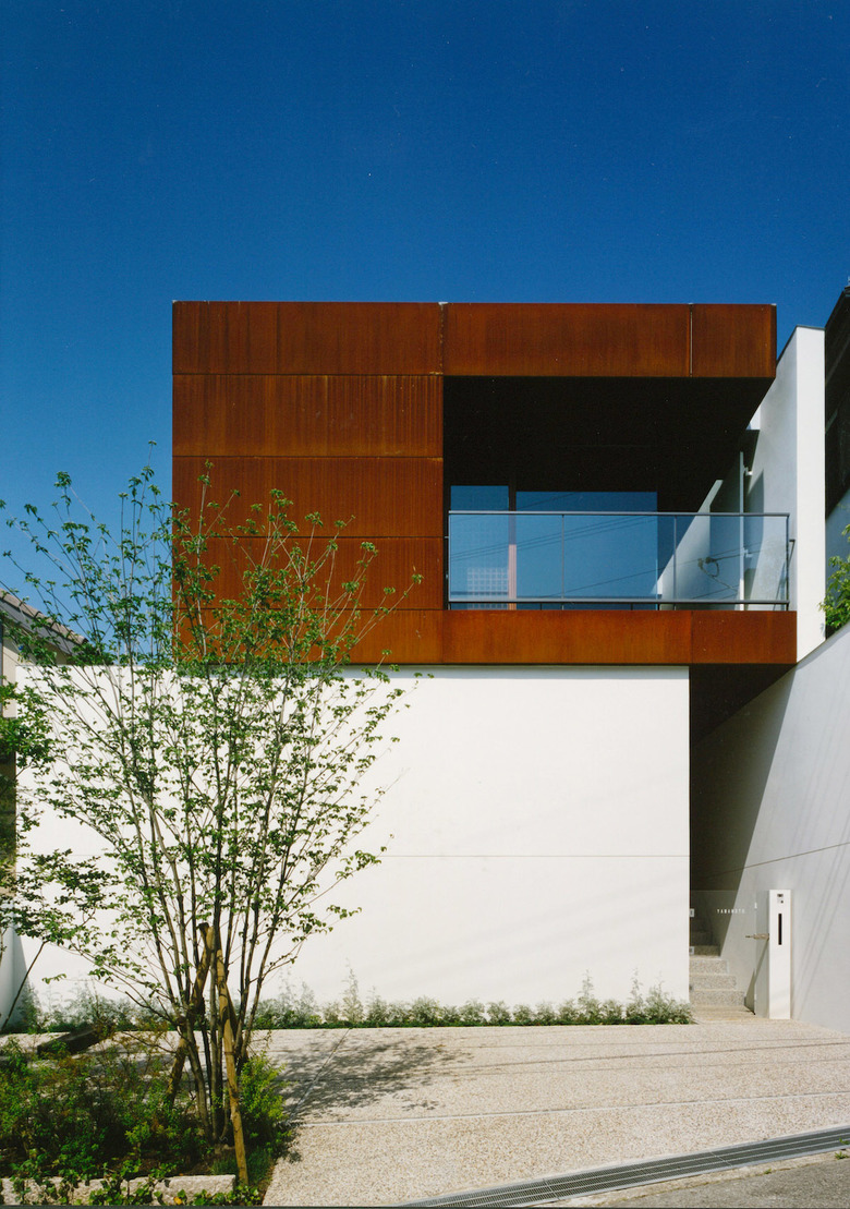 From Hankyu Minoo line Minoo station where a site is also a stoop to a waterfall in Minoo, about five minutes on foot. But it's located in the inclination of the mountain, the quiet residential area irrelevant to its convenience spreads around here, and when I go up a slope a little, there is a god of the harvest who was circled and endured the quiet in a thick forest. That was a concept in this house to follow an excellent maple tree of the 10m which was in a site originally and this tree producing all impressions in a site obediently, and I aimed at a clear plan for it. The outward appearance of the building consists of a white box which consists of the private room district where the first floors are bedrooms and the shape that the volume of the corduroy steel rust color which consists of LDK on it takes it. When the upper and lower box slipped each other, and was arranged, approach runs through a gap made of that, and even a foot of a light maple tree comes out straight for the tunnel-like dim sight. There is an entrance in the middle of the approach, and a visitor enters the interior more than the bosom where a building is invert elevation. The blowing through up which the step level went meets and invites a heart as well as light to the top to the top in front of the entrance. A serving of landscape is full of sight by the scale which is to the extent north comes off to the outside and can't think of a leaf and a powerful trunk of the refreshing maple which developed from the first floor as the second floor, all at once at the same time as I go up a void on the second floor. Its Kaede can inflate more including reception and landscape in marble on a floor. It's possible to continue between the ceiling and the floor and the residential space on the second floor where I have no interrupted one which are partitions in horizontal direction without the bowels and the thing delayed to outside again from outside and feel the maple almost overflowing everywhere. It's the state of whether it's prescribed that that place is the interior only to say that it's under the free roof when removing glass. An open bedroom equals the first floor only to a garden where I nestle close to the south side of the building to the open second floor. A box in the clear bathroom protrudes in a garden, and I take on the aspect of an outdoor hotspring bath. I'm planning for a balance as the whole by the thing which makes the nature different from two hierarchies piled last. Naturalness and something to rise and say abundant space are brought up, and doesn't anything really important go by a case that you aren't confronted with something there already and nestle close obediently, not to insist by the "shape" of the construction?