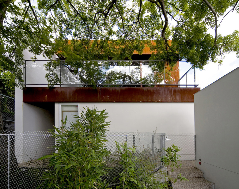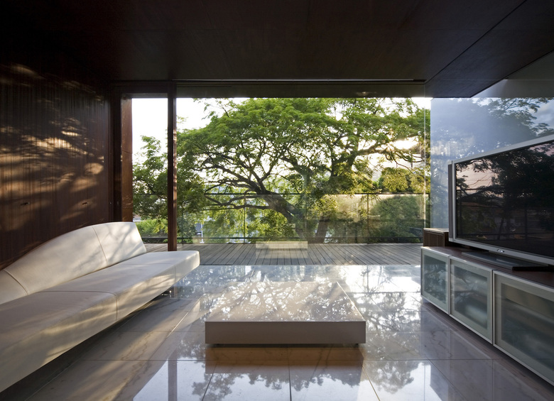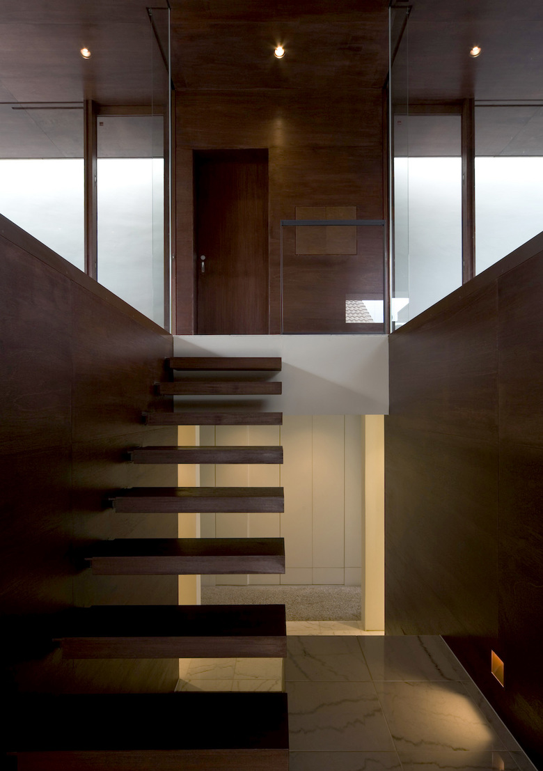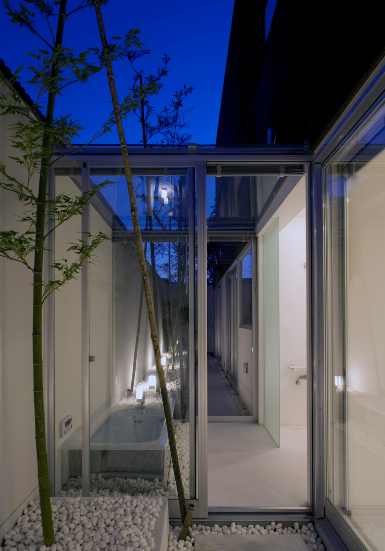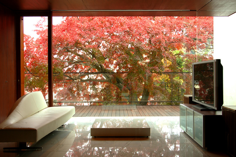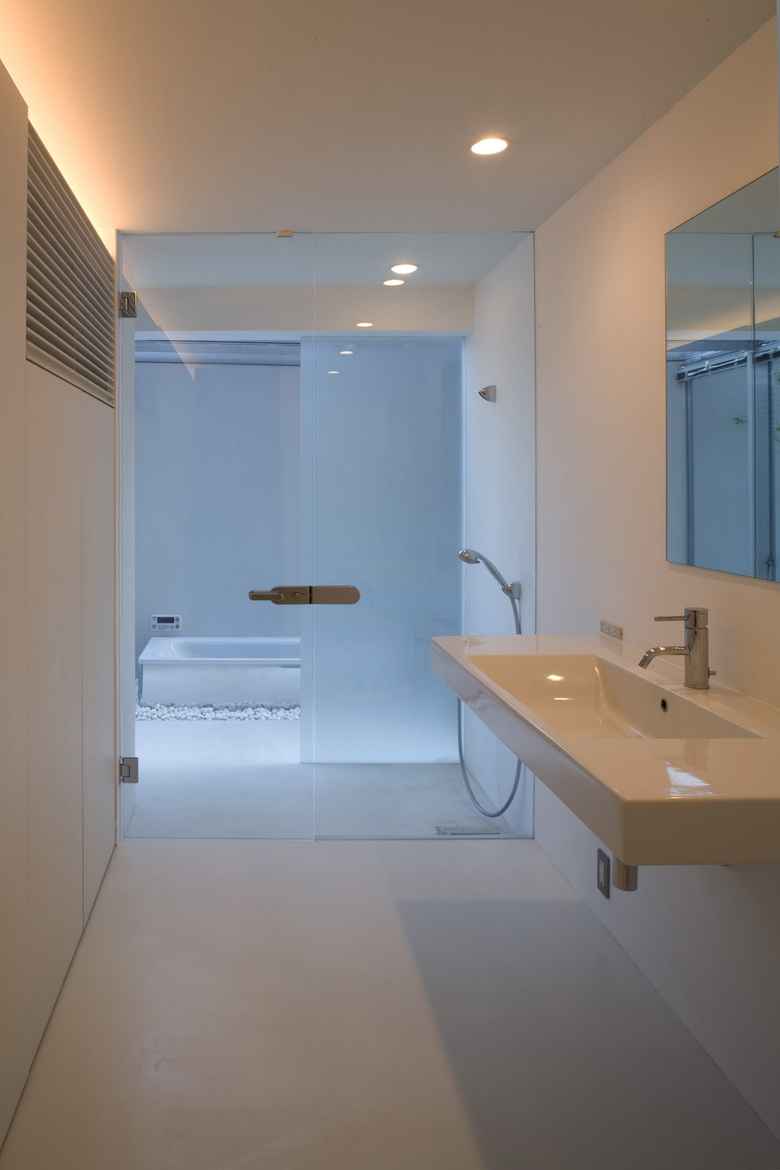 From Hankyu Minoo line Minoo station where a site is also a stoop to a waterfall in Minoo, about five minutes on foot. But it's located in the inclination of the mountain, the quiet residential area irrelevant to its convenience spreads around here, and when I go up a slope a little, there is a god of the harvest who was circled and endured the quiet in a thick forest. That was a concept in this house to follow an excellent maple tree of the 10m which was in a site originally and this tree producing all impressions in a site obediently, and I aimed at a clear plan for it. The outward appearance of the building consists of a white box which consists of the private room district where the first floors are bedrooms and the shape that the volume of the corduroy steel rust color which consists of LDK on it takes it. When the upper and lower box slipped each other, and was arranged, approach runs through a gap made of that, and even a foot of a light maple tree comes out straight for the tunnel-like dim sight. There is an entrance in the middle of the approach, and a visitor enters the interior more than the bosom where a building is invert elevation. The blowing through up which the step level went meets and invites a heart as well as light to the top to the top in front of the entrance. A serving of landscape is full of sight by the scale which is to the extent north comes off to the outside and can't think of a leaf and a powerful trunk of the refreshing maple which developed from the first floor as the second floor, all at once at the same time as I go up a void on the second floor. Its Kaede can inflate more including reception and landscape in marble on a floor. It's possible to continue between the ceiling and the floor and the residential space on the second floor where I have no interrupted one which are partitions in horizontal direction without the bowels and the thing delayed to outside again from outside and feel the maple almost overflowing everywhere. It's the state of whether it's prescribed that that place is the interior only to say that it's under the free roof when removing glass. An open bedroom equals the first floor only to a garden where I nestle close to the south side of the building to the open second floor. A box in the clear bathroom protrudes in a garden, and I take on the aspect of an outdoor hotspring bath. I'm planning for a balance as the whole by the thing which makes the nature different from two hierarchies piled last. Naturalness and something to rise and say abundant space are brought up, and doesn't anything really important go by a case that you aren't confronted with something there already and nestle close obediently, not to insist by the "shape" of the construction?