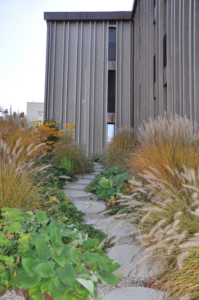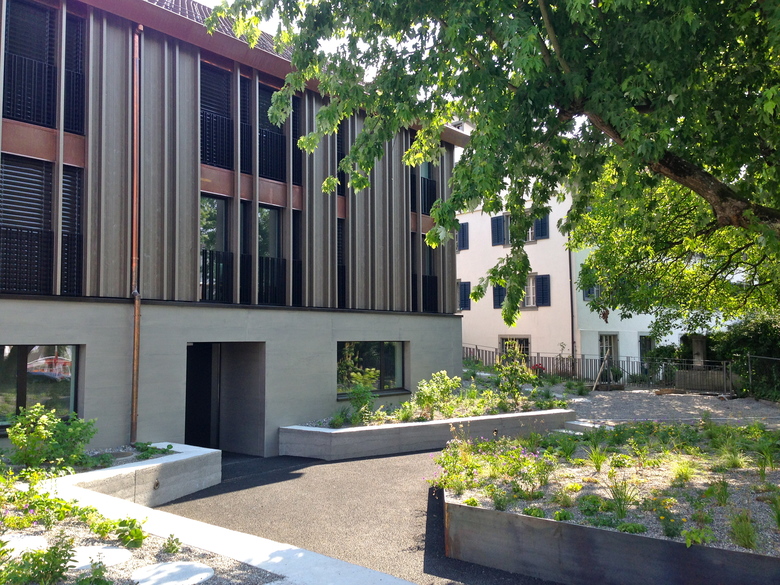 Alterswohnungen im gehobenen Segment im Dorfzentrum von Küsnacht. Ehemalige Villenbesitzer vereinfachen ihr Wohnen und ziehen ins Dorfzentrum. Ersatzneubau für ein Denkmalschutzobjekt mit Baumbestand. Artenreiche Pflanzungen schaffen auf engem Raum ein vielfältige Gartenstimmungen.