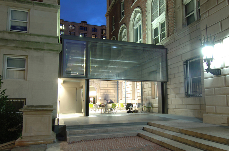 This project is an alternative configuration for the public spaces of the Graduate School of Journalism and an addition to the building that sensitively responds to the McKim, Meade and White context. Included in the project are spaces for the Journalism Library, the offices of the Columbia Journalism Review, assorted faculty and administrative offices, and classroom space. Central to the proposal is the introduction of several new spaces to serve as a social and intellectual center for the School: a multi-purpose “social hub” for student-faculty interaction as well as larger meetings with visitors to the school, and a more informal student lounge space and café. The social hub accommodates a diverse range of programs: study space for students in between classes, meeting space for students and faculty, informal presentation space for visitors from the journalism industry, and other such communal event spaces for the Journalism School. The café/lounge is intended to be a louder, more informal space for the School’s students, complete with plasma screens and LED signage that will broadcast the news to patrons. Its site at the formerly outdoor space between Journalism and Furnald allows it to engage the campus environment while also remaining within the School of Journalism. A transparent glass structure is proposed to give the School a more active presence on its entry plaza.