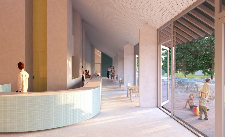 Der Neubau versteht sich als grenzdefinierender Filter zwischen Natur- und Siedlungsraum und bildet hierdurch sowohl die neue Eingangsfassade des Hallen- und Freibades als auch den nördlichen Rücken des Freibades Oberdorf.