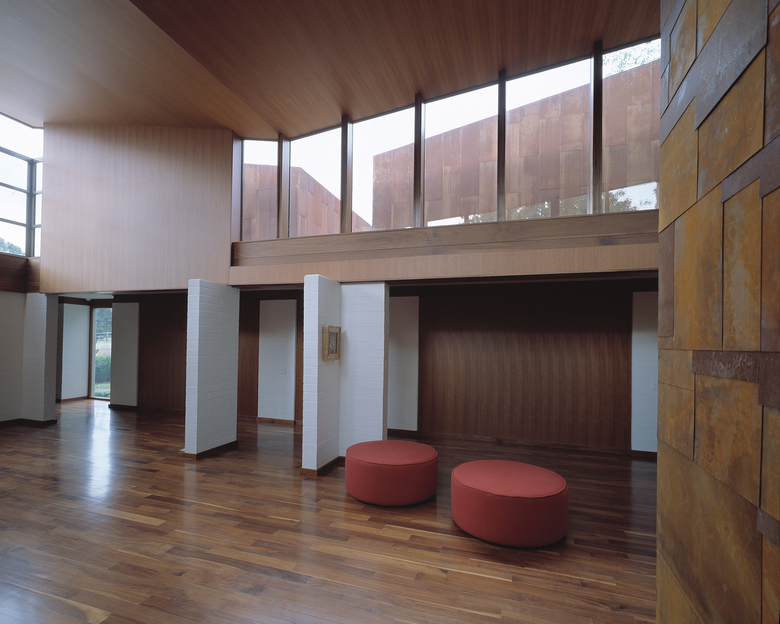 Concrete block piers articulate the corners of each existing space and over time have settled differently, leaving few plumb surfaces to work from. Our tactic was to float cherry and walnut veneer panels over the pier walls and along the ceiling forming a detached interior skin. Flooring of rift-sawn cherry and walnut also act to form an interior liner. Taut and highly crafted, this refined surface acts as an interior liner to the exterior monitors clad in weathering steel shingles. There is a quiet resonance between old and new spaces, enveloped in the warmth of various American hardwoods - they combine for a new material presence that softens their differences.