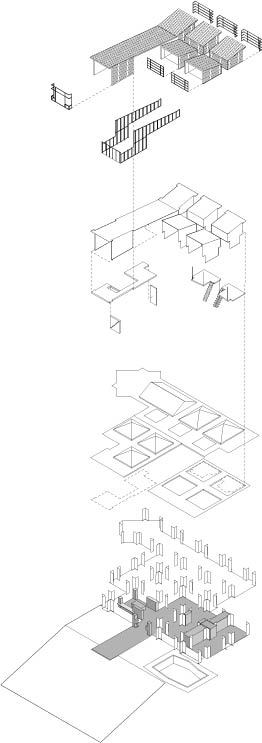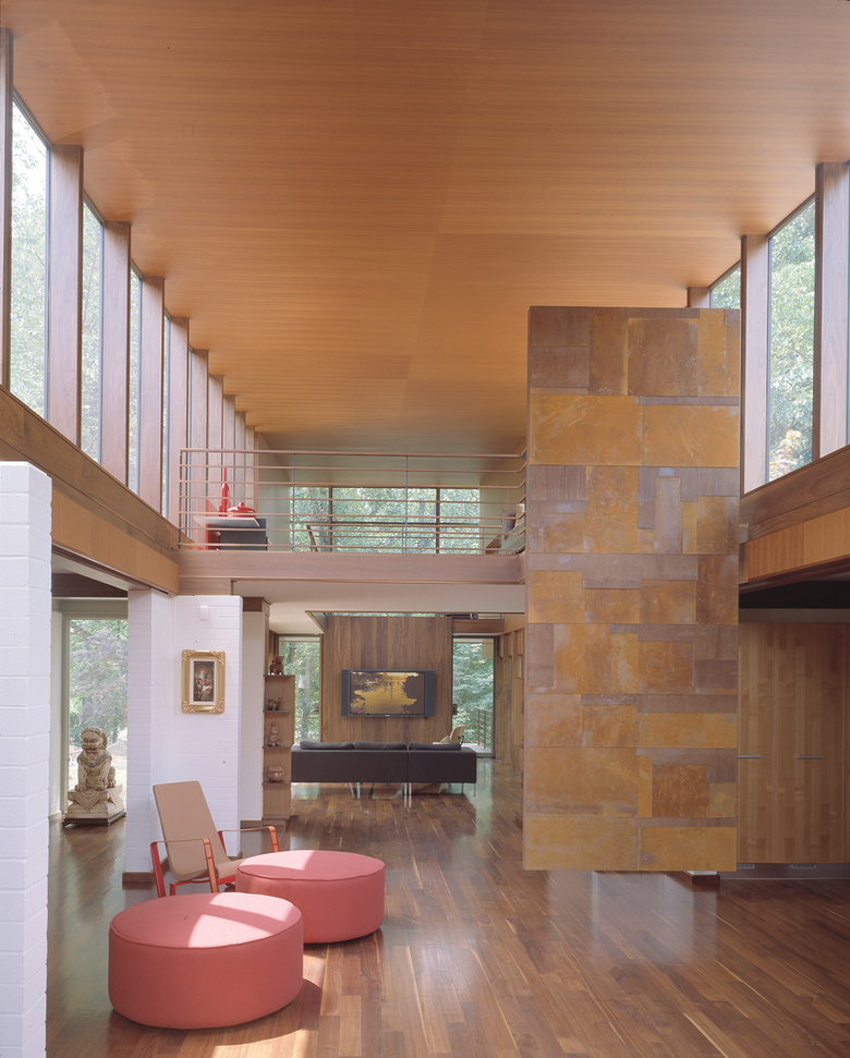 The low-slung existing tartan grid structure, with traces of both Kahn and Wright, was instilled with a new sense of hierarchy through the addition of light monitors and suspended lofts to the children’s spaces, a new kitchen, and a great room with a saddle-back roof for living, entertaining, and the display of fine art. Vertically oriented monitors bring much-needed light through steel windows into the once gloomy interiors most damaged by fire. The great room is naturally lit from all sides and fills the center of the house with light and views to the sky and adjacent monitors above. With two children at one end of the house and their father at the other end, the great room is positioned to unite the family in one grand social space. The room cuts across the non-directional grid of the existing structure providing an enriched and contrasting spatial complexity. At the end of the mezzanine a flying wall - a vertical tableau - appears to float in space, the composition of its rusted metal shingles choreographed to the music of Neil Young and the Band.
