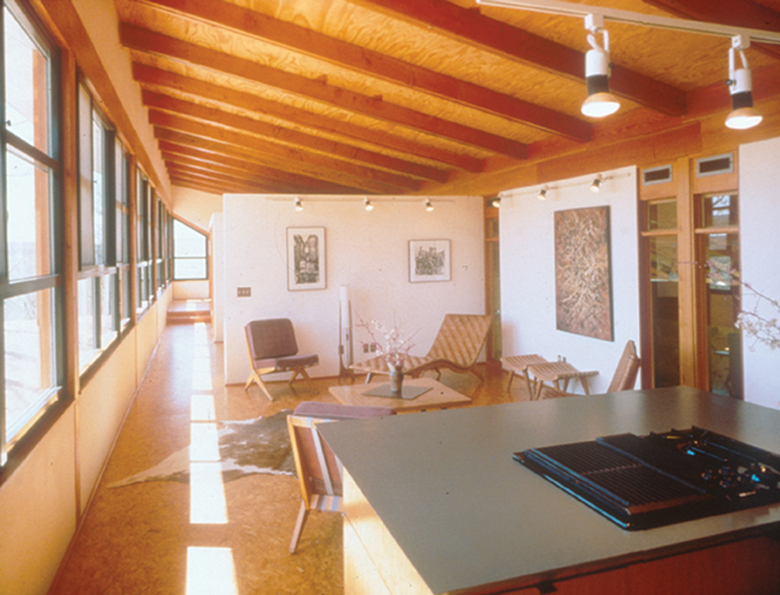 Along the south facade, the operable second-floor window wall provides expansive views of the landscape beyond and takes advantage of the prevailing winds from the southwest. A generous roof overhang allows for shade on the south facade in the summer and lets sun in during the winter months.