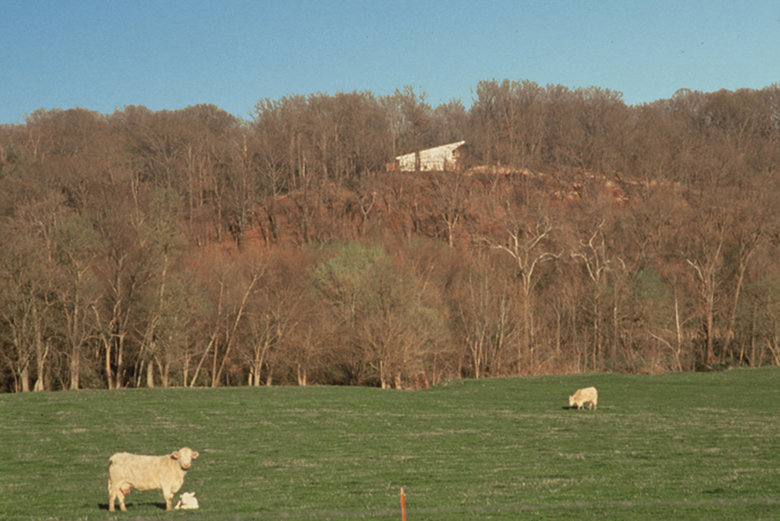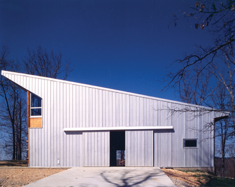 This ”hybrid-house” developed from our observations on how a boundary makes place out of space and how a frame is used to articulate form. The intent was to provide a sense of order; an integrated relationship between coexisting but discrete spatial conditions of artifice and land. High above the Illinois River valley, on a three-sided sloped hill, the BarnHouse, and its open paddock, is intimately linked with the pristine, adjacent forest by a wooden fence, which is a unifying element that provides scale and lateral support for the structure.
