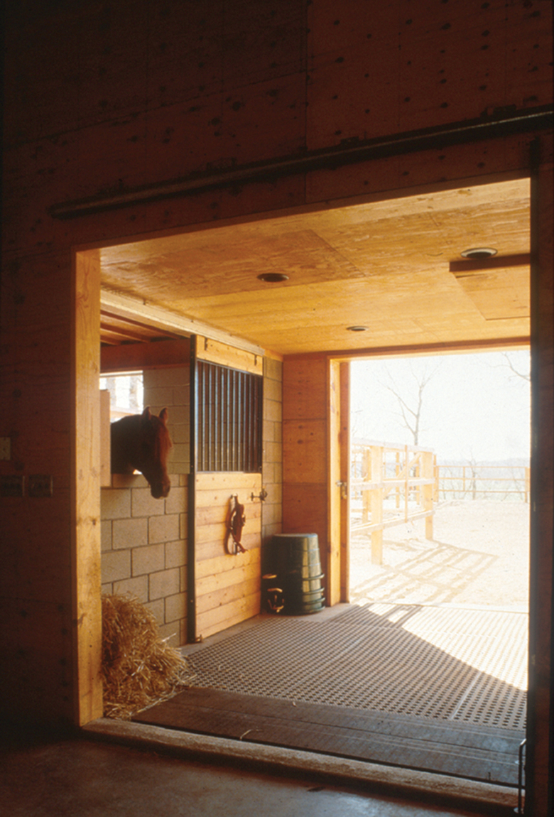 The interior living area embodies many of the concerns expressed in the exterior. Museum stud walls define the spaces and create a sense of openness. At the ground floor, a structural column system that references local pole-barn construction, provides interchangeable spaces that can accommodate either vehicles or animals. Both inside and out, careful attention to construction detail and the choice of material finishes creates a system of structural articulation that helps inscribe the BarnHouse with its natural setting. The primary assertion throughout this project is that architecture is a studied relationship between building and land. As I reflect upon the quality of spaces we made for the animals and the folks I can safely say they both got a pretty good deal.