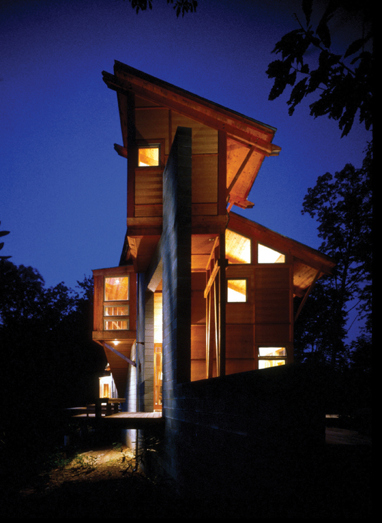 My first residential design was for the late June Moore, an ex-girlfriend’s mother (never burn your bridges). June wanted the house to take advantage of the views of the surrounding landscape and to prioritize privacy. Set between vistas of mountains to the north and woods to the south, the house has two distinct faces. The split-personality scheme is an extension of the parallel yet opposing characteristics of the site and its owner, a politically and fiscally conservative free spirit who drove a Z28 Camaro.