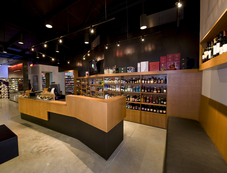 Wedington Liquor provides visitors with an opportunity to transition from the hectic pace of traffic and sprawl outside to a relaxed atmosphere inside. Integrated displays showcase not just a wide array of products, but the beauty and craft of the bottles themselves. An elongated threshold features modules of folded steel plate that each house a pair of wine bottles, along with a folded ceiling plane the evokes the profile of a wine bottle. The entry culminates at a wall of red glass; a wall seemingly filled with rich red wine. An extensive selection of domestic and international wines is housed in custom-designed displays, acknowledging the care and craftsmanship required to produce each wine. Integral seating allows for impromptu wine tastings and encourages the social interaction so often lost in the market today.