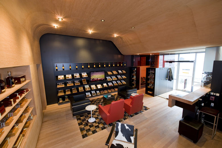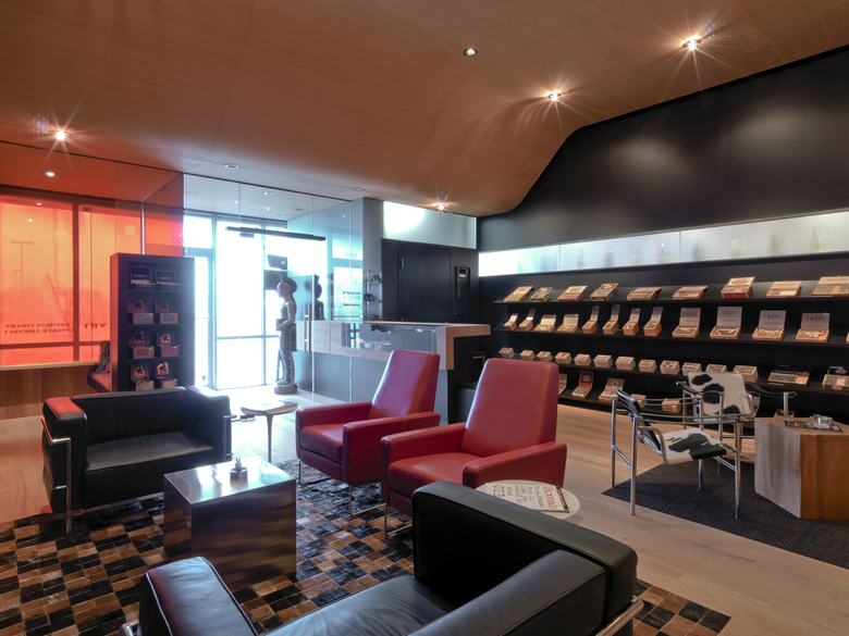 The Wedington Cigar Shop elevates the experience of patrons by immersing them in the rich aroma and tradition of cigars. Rather than being relegated to a small, secondary humidor, the entire space functions as a humidor with cigars on open display. A sensuous wrapper of Spanish cedar lines the floor, rear wall, and ceiling, giving the sense of being inside an exquisite cigar box. Strict temperature and humidity control preserve the delicate nature of the cigars, while providing a rich tactile experience for the visitor. Although housed in a ubiquitous suburban building, the Wedington Cigar Shop provides a detailed respite that is attentive and comfortable.