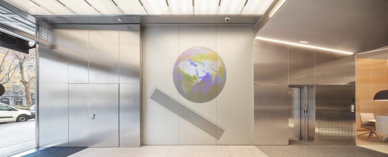 At night, a moving image of the globe is projected on the entrance walls, a reference to the international character of this space.