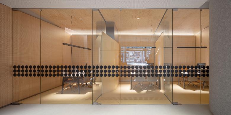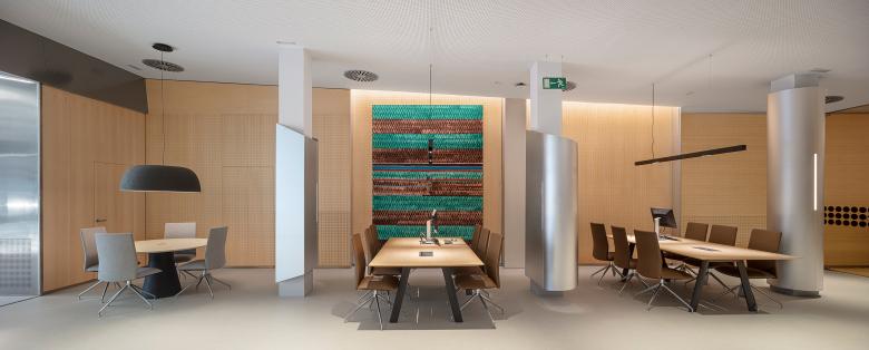 From here, going down, we would arrive at a large hall for collective events. The interventions of the artist Alberto Peral accompany us here. Going up, the private work area and the personal meeting with the client. The elevated but close view over Diagonal Avenue is the central argument of the scene in the more public spaces.