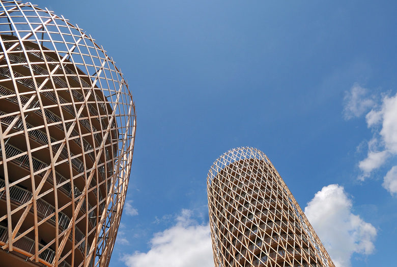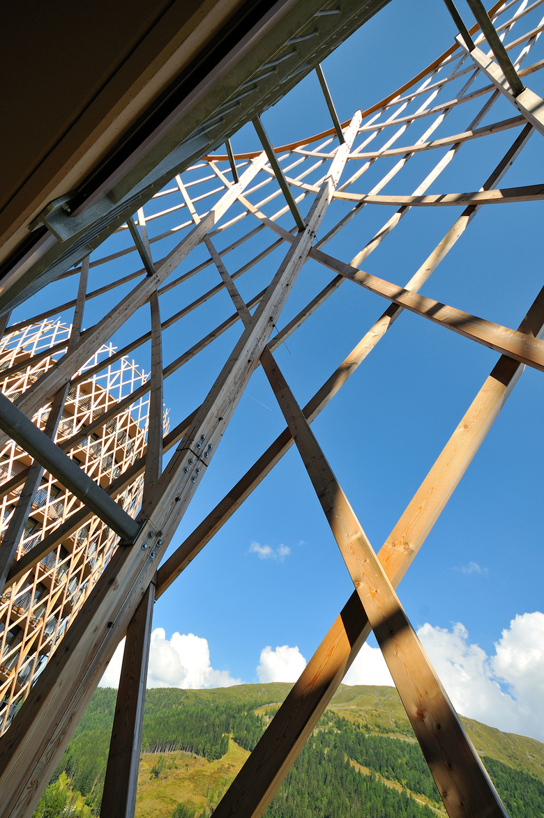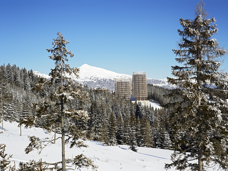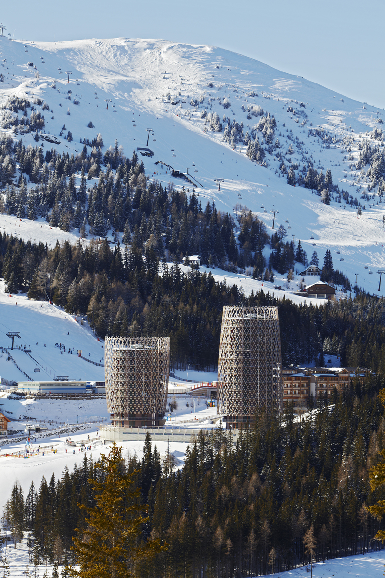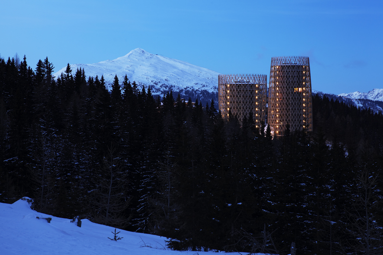 Like monoliths rising up in the mountainscape. Vertical landmarks cladded with larch wood, connected with a biomass generator.