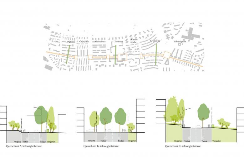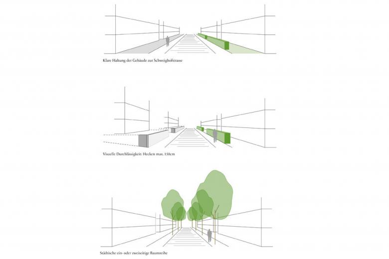 Die Schweighofstrasse wird Teil des Freiraumnetzes. Mit unterschiedlichen Massnahmen wird sie entschleunigt und attraktiver gestaltet. Ziel ist es, mit örtlicher Angliederung von Nutzungen mit öffentlicher Ausstrahlung sowie Bauten mit strassenseitigen Hauszugängen eine städtische Strasse mit Wohn- und Bewegungsqualitäten zu erreichen. Die gewählten, unterschiedlichen Baumstrukturen reagieren in den verschieden Teilstücken auf den spezifischen Kontext. So wird eine für die „neue Schweighofstrasse“ charakteristische Dramaturgie erzeugt, die aus verschiedenen, in das Quartier eingebetteten Sequenzen besteht. Sie ist Teil vom feinmaschigen Erschliessungsnetz und wird von allen Verkehrsteilnehmern gleichberechtigt genutzt.