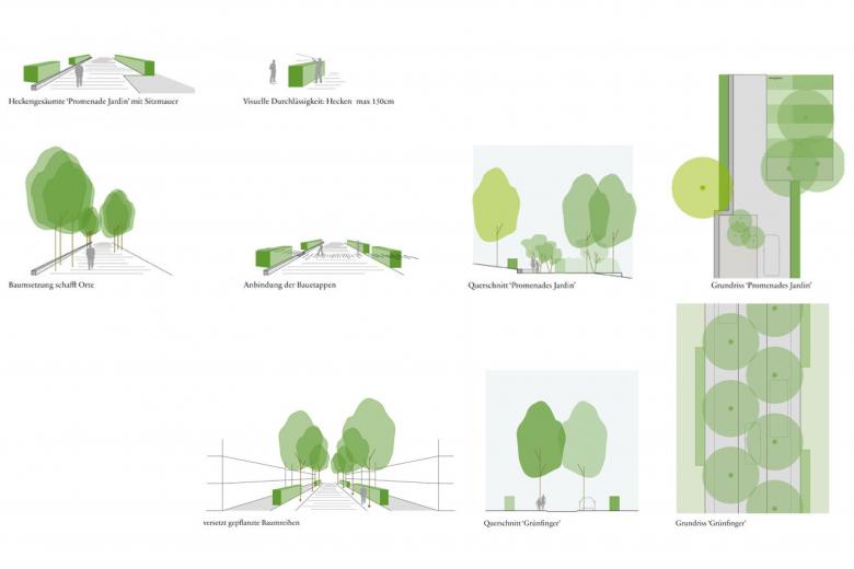 Mit einer Freiraumstruktur, die auf den bestehenden Freiraumelementen wie „der Grünfinger“ und der parallel zu den Höhenkurven verlaufenden Wegen durch die Gartenlandschaft basiert, wird auf die zukünftige erhöhte Dichte reagiert. Die in der Lage auf dem Bestand beruhenden „ Promendes Jardin“ werden neu eingeführt. Sie garantieren den weiterhin gärtnerischen Charakter der öffentlichen Räume und ermöglichen mit ihren Aufenthaltsqualitäten eine attraktive Bewegung für den Langsamverkehr parallel zum Hang. Wichtige Ereignisse am Friesenberg werden durch die ‚Promenades Jardins’ zusätzlich verbunden und helfen das Quartier weiter zu beleben. Die Aussenräume der neuen und alten Siedlungen unterstützen durch ihre Gestaltung und Konzeption die Bedeutung dieser übergeordneten Freiräume. So wird ein feinmaschiges Durchwegungsnetz etabliert. Die Wege werden weitgehend von Parkierungsfeldern befreit.