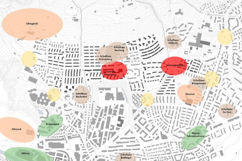 Innerhalb des feinmaschigen Netzes gilt es vorhandene Akzente mit erhöhter Bedeutung zu stärken und weiter zu entwickeln. Diese können sowohl von der Nutzung als auch von der Lage im Quartier zu „Ereignissen“ werden. Neben vielen nachbarschaftsspezifischen „Ereignissen“ wie Spielplätzen, Schulen, Krippen, Aufenthaltsorten, Bushaltestellen und so weiter sind dies auch die quartierspezifischen mit Ausstrahlung in die Stadt, wie das bereits geplante FGZ Zentrum und der neu zu schaffende Schweighofplatz mit der Haltestelle der SZU.