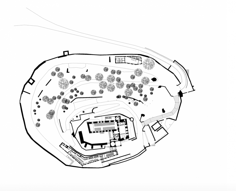 Hambach Castle, the site of the "National Festival of the Germans," represents European and German history in a unique way. The goal of the contemporary intervention was to carefully clean up, open up and condense the preserved substance. The interventions were only intended to support the historic substance and not to intervene significantly, so that spatial and chronological relationships become legible again. In the south, a new restaurant building was added to the castle, which is architecturally oriented to the historic defense walls. A new visitor's house was built on the outer ring wall, its cubature developing from the archetypal house form and reinforcing the typological character of the outbuilding. Its arrangement reflects the structural hierarchy of the castle complex: crowned by the castle itself, it unfolds over the inner ring wall to the outer wall with the visitor house. For the facades, the yellow Leistädter sandstone typical of the area was used, which had already been used in the historic palace building.