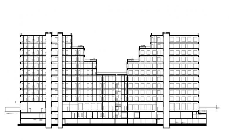 The two north and south facing head structures of the building are staggered in two-storey steps up to the eleventh storey. The façade has a unified brick facing, underlining the sculptural quality of the building. The light creamy-beige hue of the stone answers to the granite of the “Platinum” house. A hotel will be housed in the northern part, with the southern part to be used as offices.