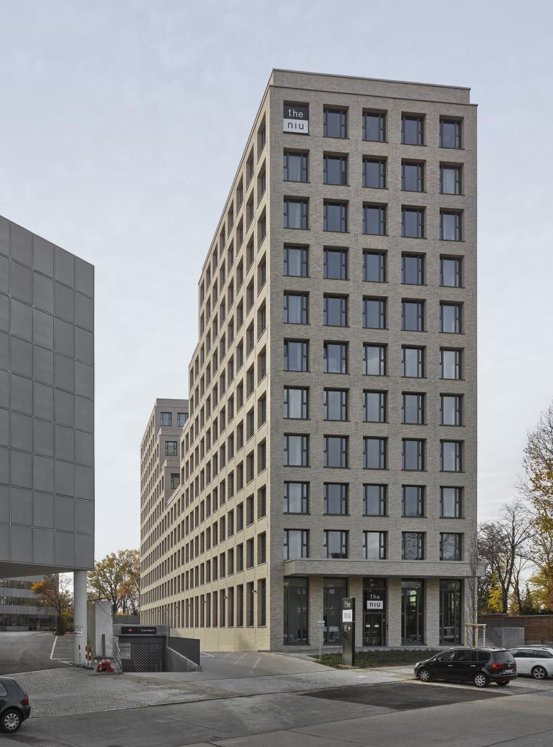 The hotel and office block in the Berlin district of Schöneberg has been conceived as an accompanying piece to the office high-rise “Platinum” by architect Jürgen Sawade. The planned new-build is complementary to the structure of the “Platinum” building, and due to the directionally reverse cascade, succeeds in achieving a retroactive urban integration, so to speak. On the east-facing aspect the building reveals a completely contrary structure: the new Zwölf-Apostel-Kirchhof (Twelve Apostles Churchyard) with its listed chapel by Paul Egeling. On this side, the building completes a silhouette-like cityscape, freeing the cemetery from its enclosed location. The new ensemble comprises a block, that in a way echoes the adjacent urban planning area, the popular so-called “Schöneberger Linse” in a smaller form.