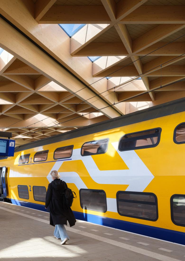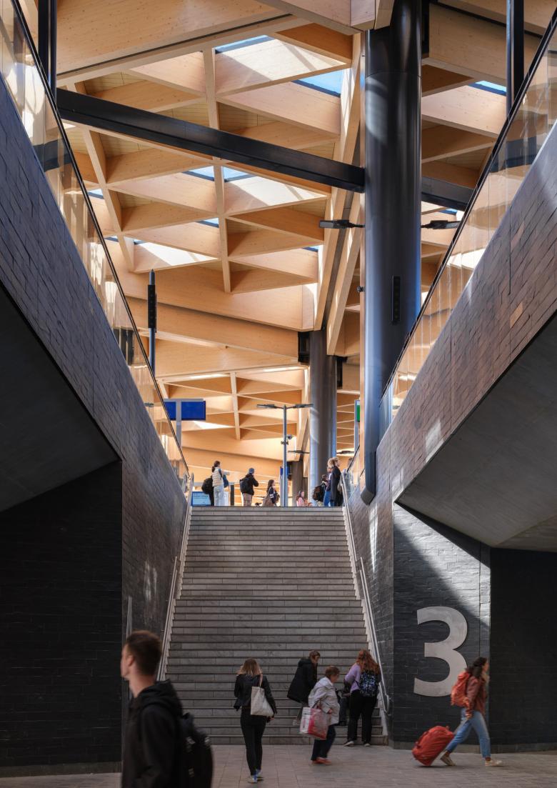 As the most iconic element of the station’s design, the wooden roof mimics a tree canopy. It boasts visual simplicity and sophistication, uniformly connecting the various quadrants of the transport hub, ensuring orientation from all sides. The roof is composed of 23 wooden triangles, each measuring 27 metres long. Almost every node and column faces a different direction, carrying a significant force load while still maintaining the architectural ambition. The triangular skylights allow daylight to fall on the platform and lead passengers to the pedestrian tunnel.Inspired by the local Veluwe landscape, the use of complementary natural materials such as wood, stone, glass and steel, together with the robust architectural detailing, make the design not only durable but also timeless, bringing a sense of nature into the train station itself. Alongside beautiful design, functionality was also at the core of our combined approach. The team connected all elements of the passenger journey, embedding intuitive spatial wayfinding into the designs and enabling people to move around quickly and easily. By embracing the station’s surroundings, it was possible to create a true sense of place from the moment passengers step out of a train.