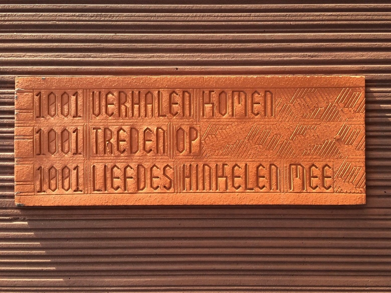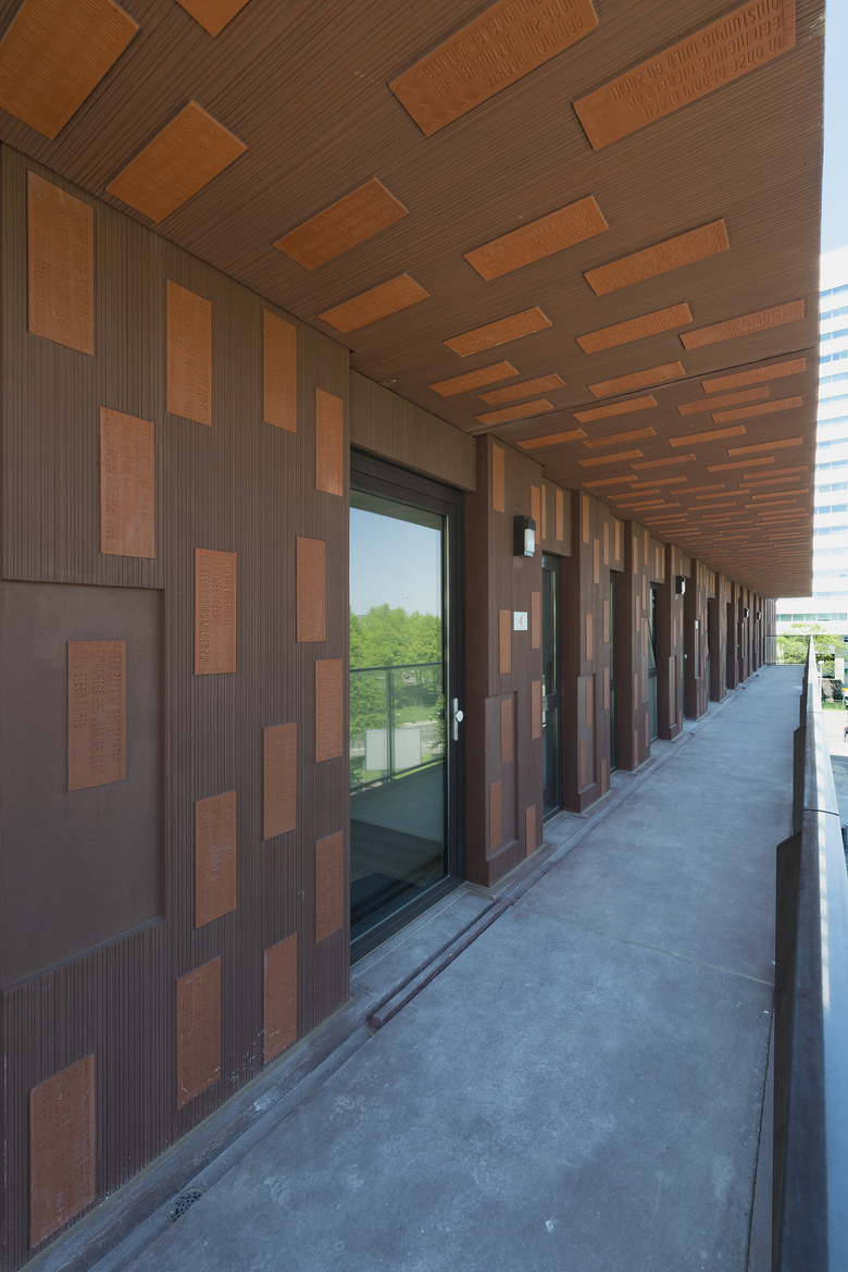 The facade is ‘slow made’ with consideration of local materials and production techniques. The colour harmonizes with the brickwork facades of neighbouring new developments on Churchilllaan, but it is constructed of concrete. The brown concrete elements, each two floors tall, possess surface texture and relief details. This effect is enhanced by the incorporation of 13,000 ceramic tiles, made by Royal Tichelaar Makkum – the oldest company in the Netherlands and world-famous for its ceramics designs. Based on a design by visual artist Milou van Ham in collaboration with poet Tsead Bruinja, these tiles feature 16 different lines of poetry that lend the building an identity specific to the location.