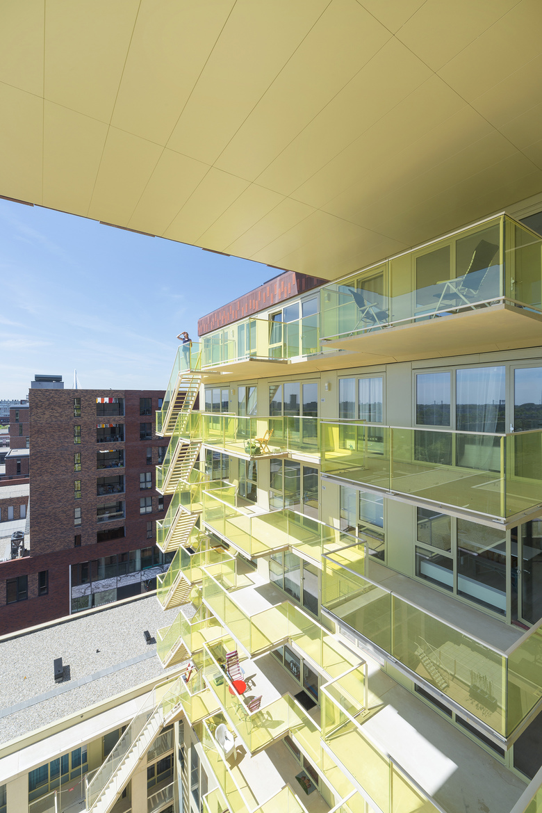 The materials used for the inner facades contrast starkly with the outer facades, enhancing the plasticity of the building. Railings in yellow glass and champagne-coloured frames ensure that, even when the weather isn’t great, De Verkenner still has a sunny and sparkling appearance that radiates throughout the neighbourhood.